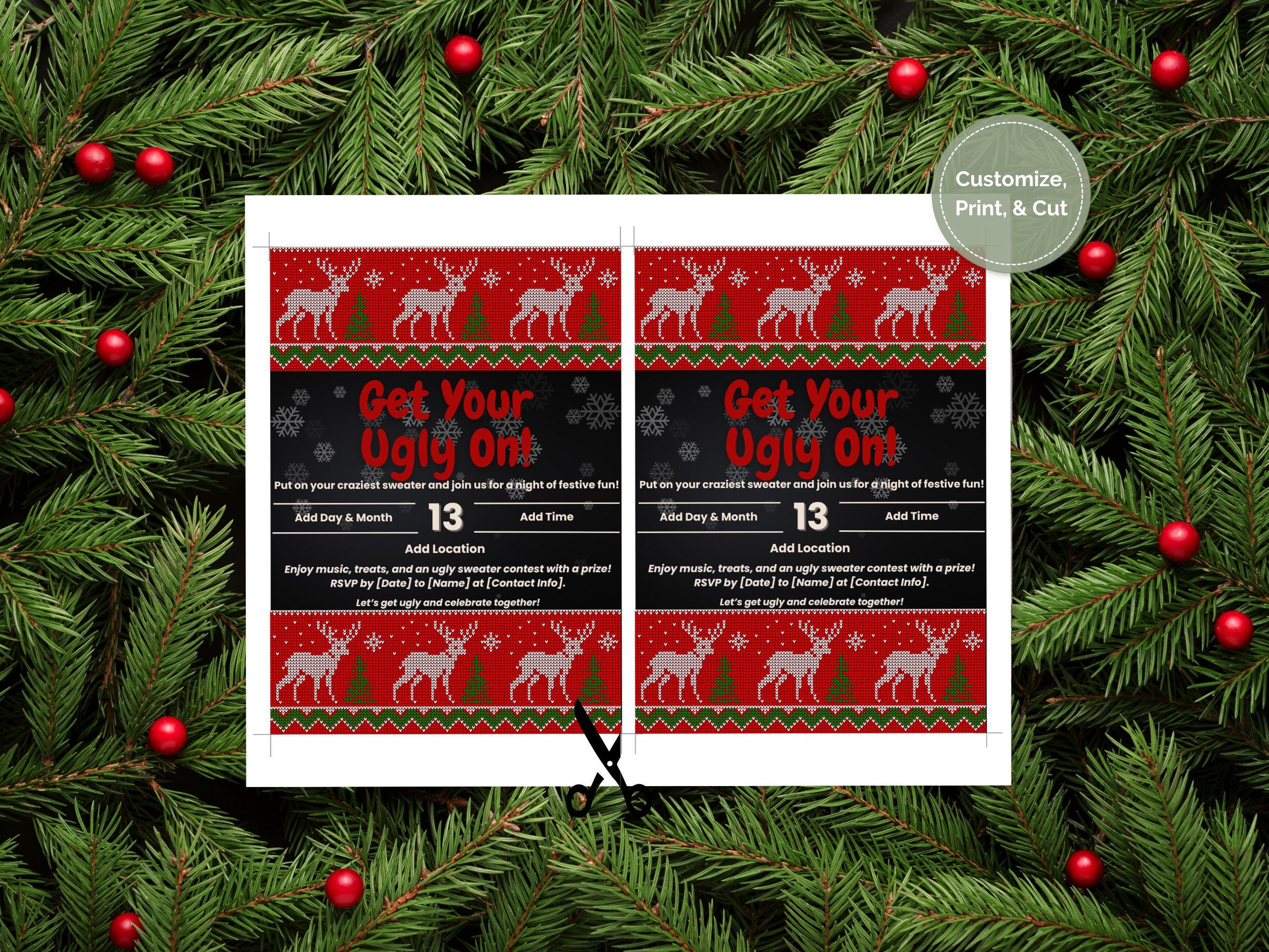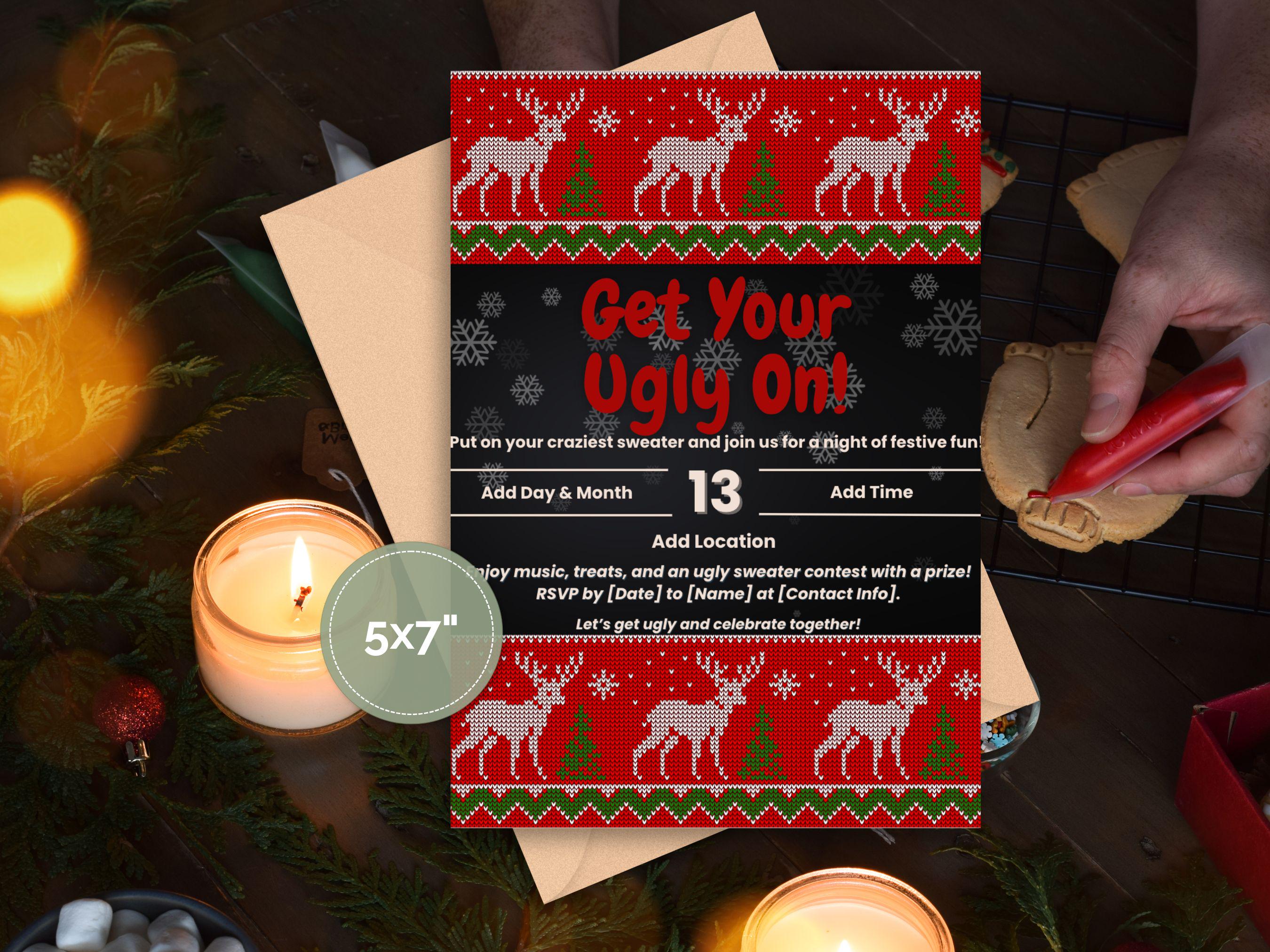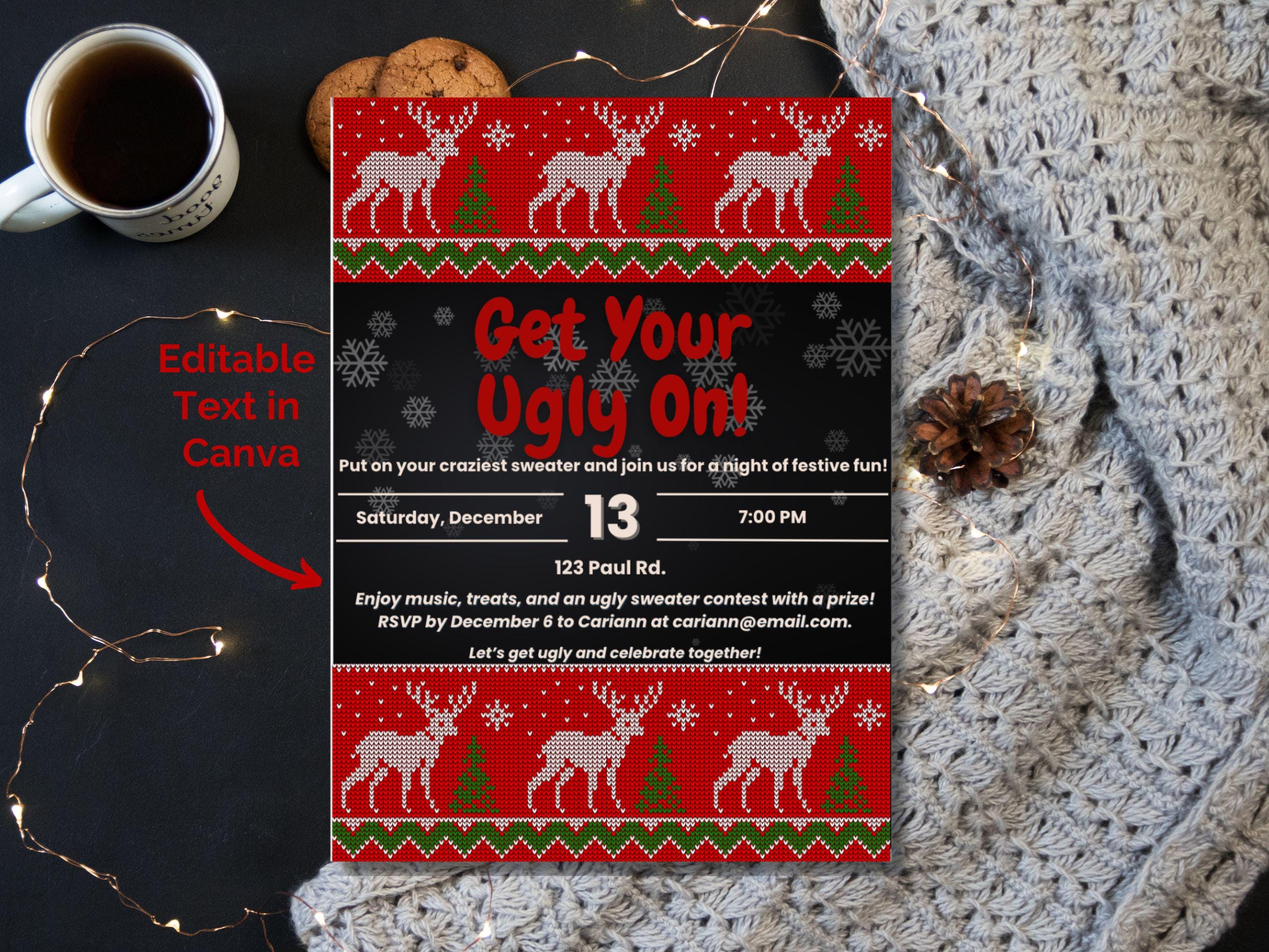 What's Included: Instant Canva Access: 💻 Edit all text fields, including date, time, location, and RSVP info, right after purchase. No special software is needed! Bold & Festive Design: A unique look featuring classic Christmas colors and a fun sweater pattern that makes your party stand out. Print or Send Digitally: 💌 Print from the comfort of your home, use a professional print shop, or go paperless and send via email or text message. High-Resolution Quality: Your final invitations will be crisp, clear, and ready to impress.