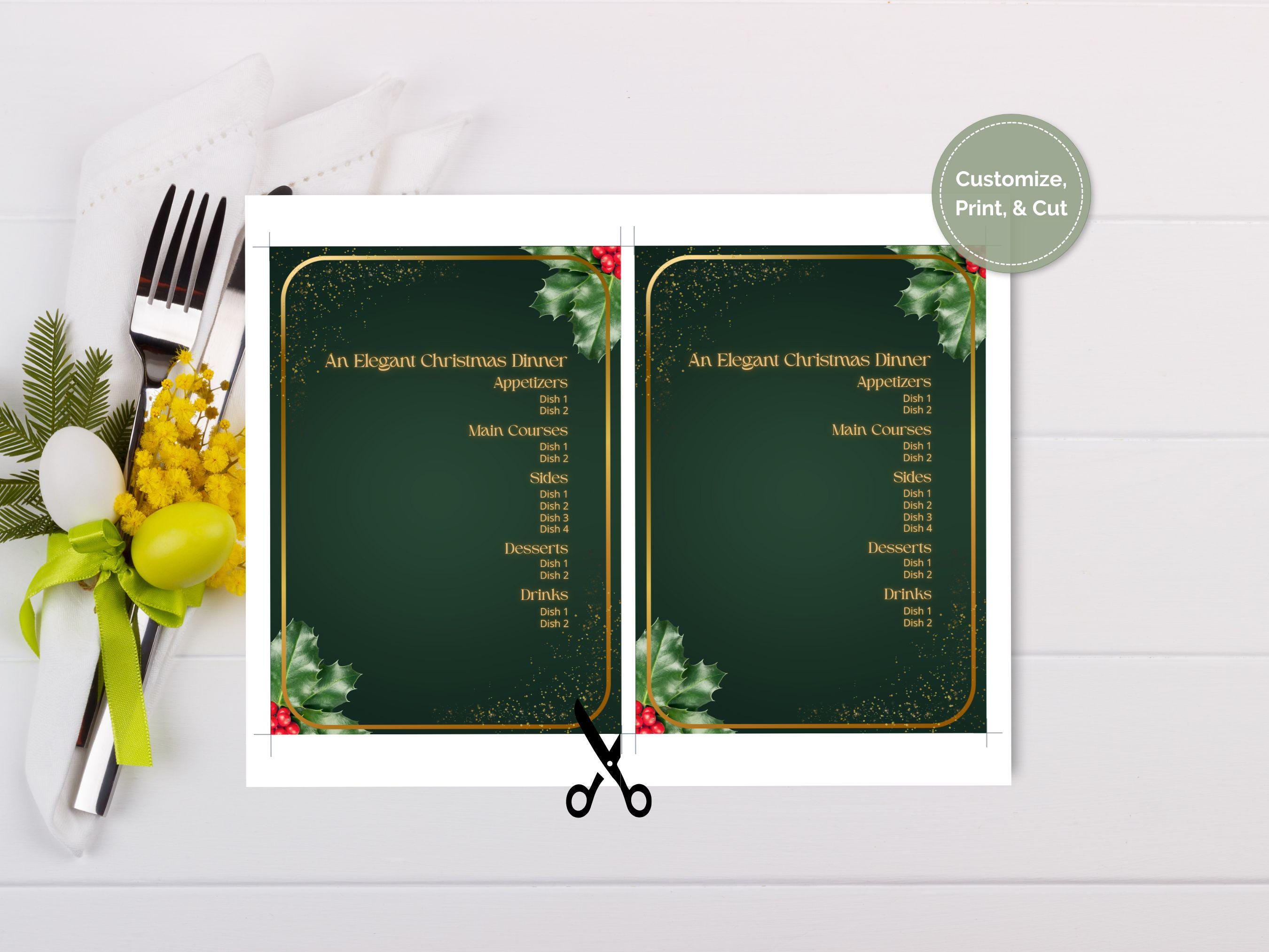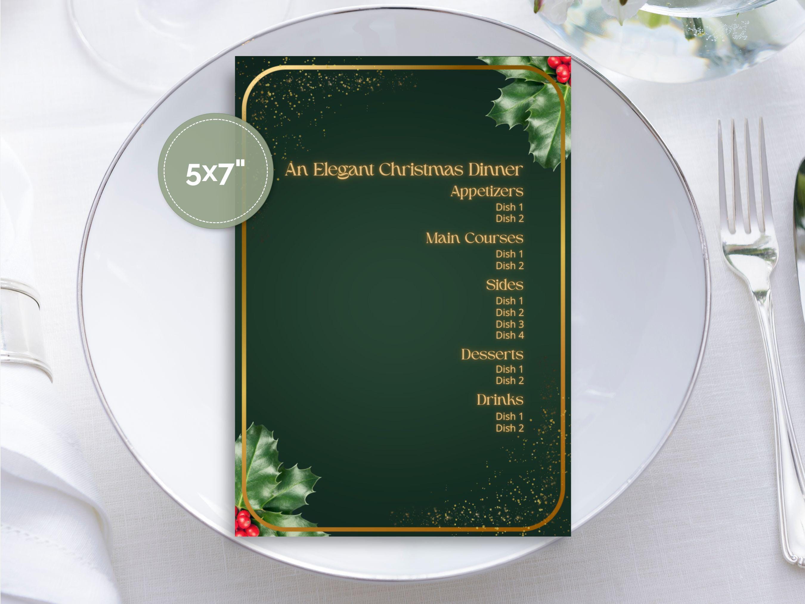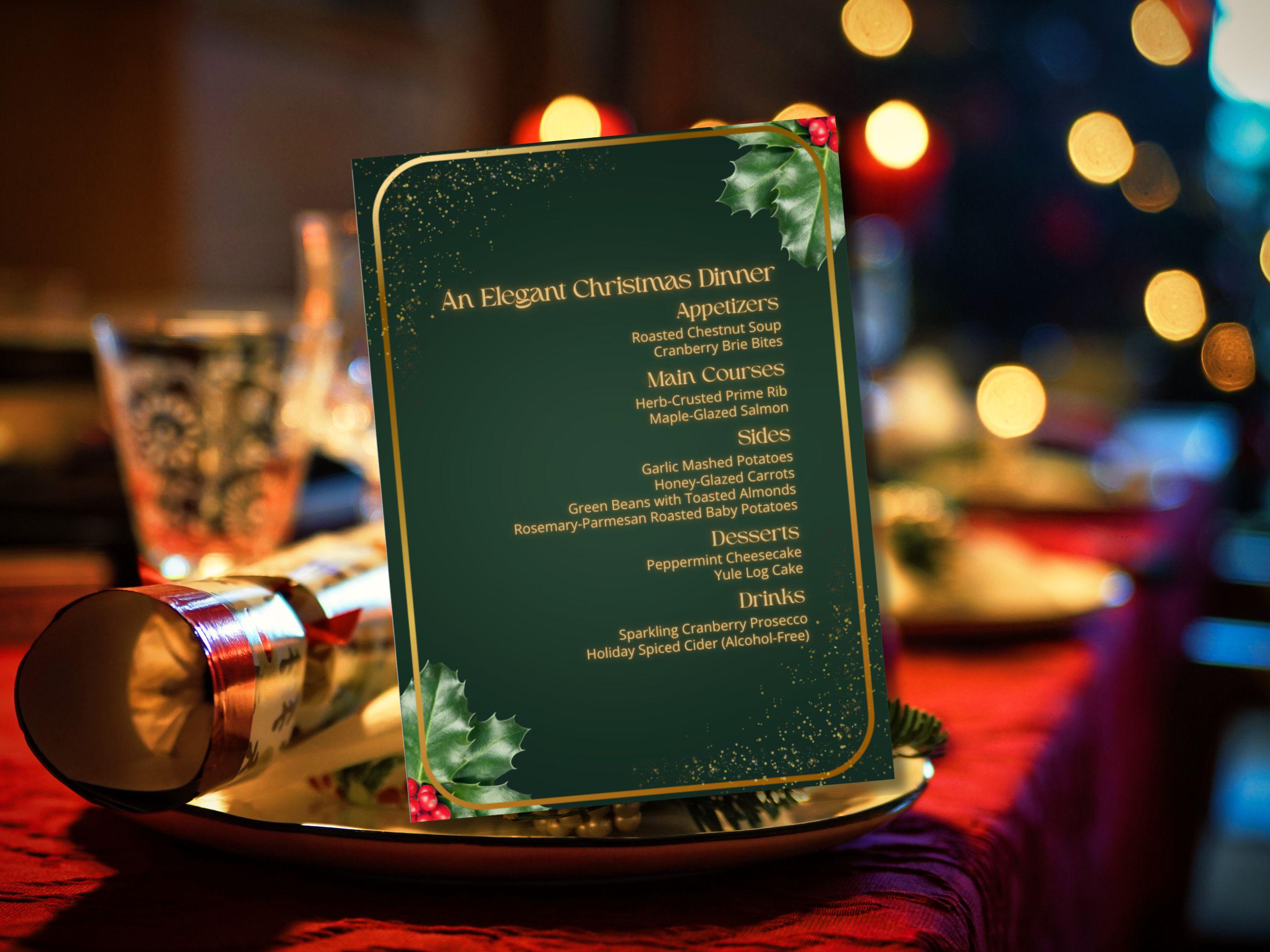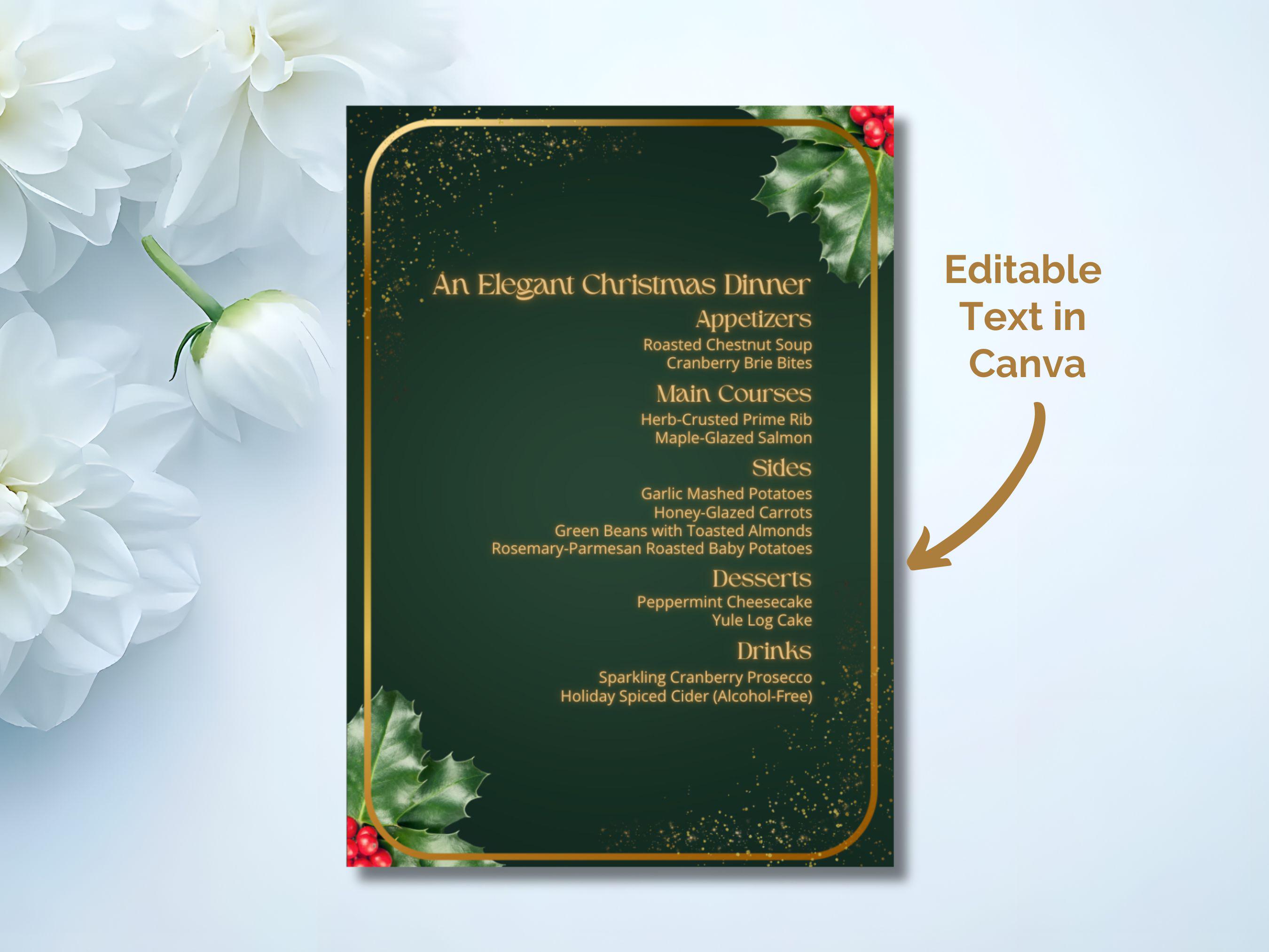 🎄 Elegant Christmas Dinner Menu Template ✨ Transform your holiday gathering into an unforgettable experience with this luxurious Christmas dinner menu template! Designed to impress, this menu features a deep forest green background, golden accents, and festive holly and berry details—perfect for adding a touch of sophistication to your table setting. Whether you're hosting an intimate family dinner or a grand holiday feast, this menu will set the tone for a magical evening. 🕯️🍽️