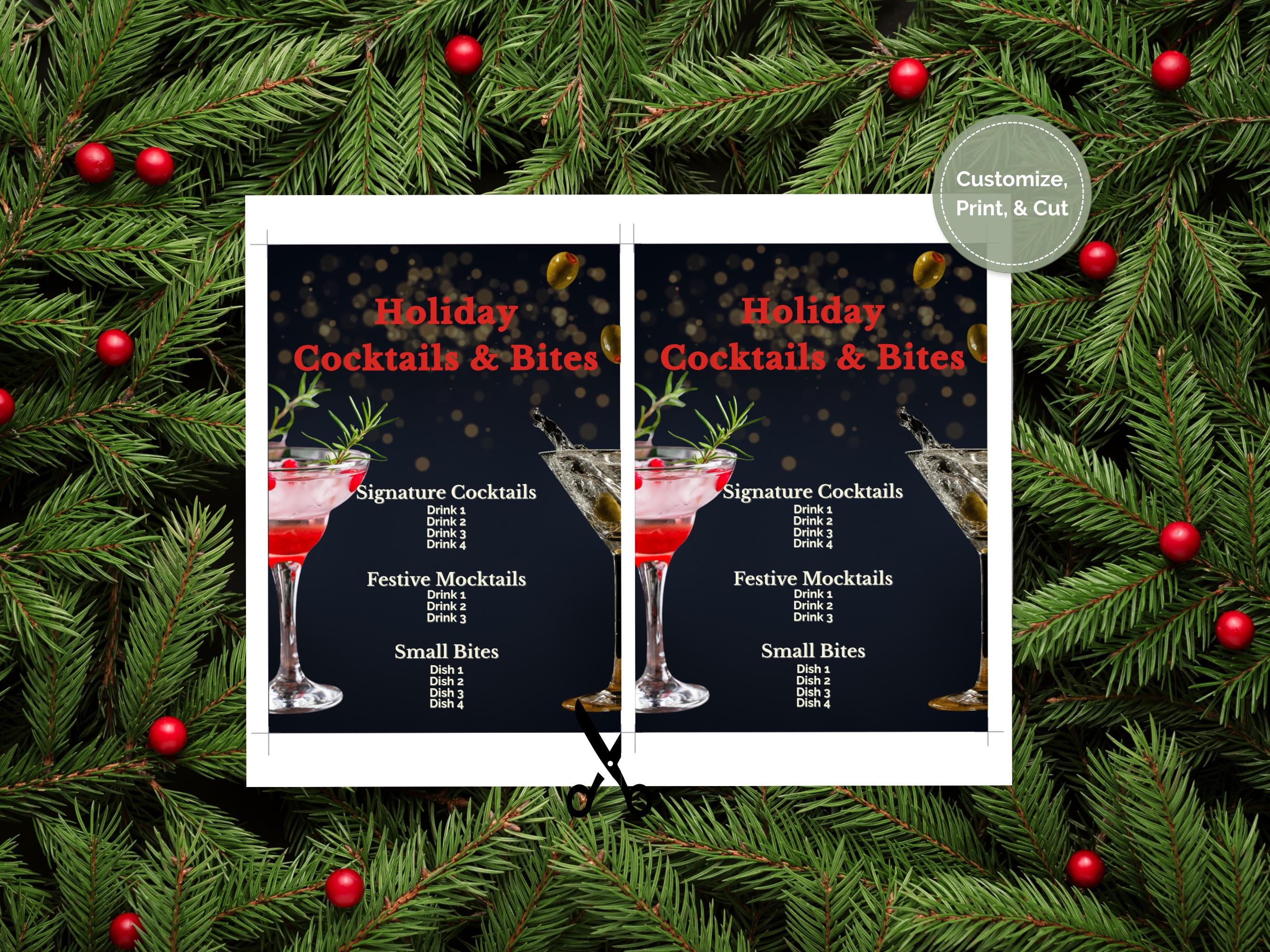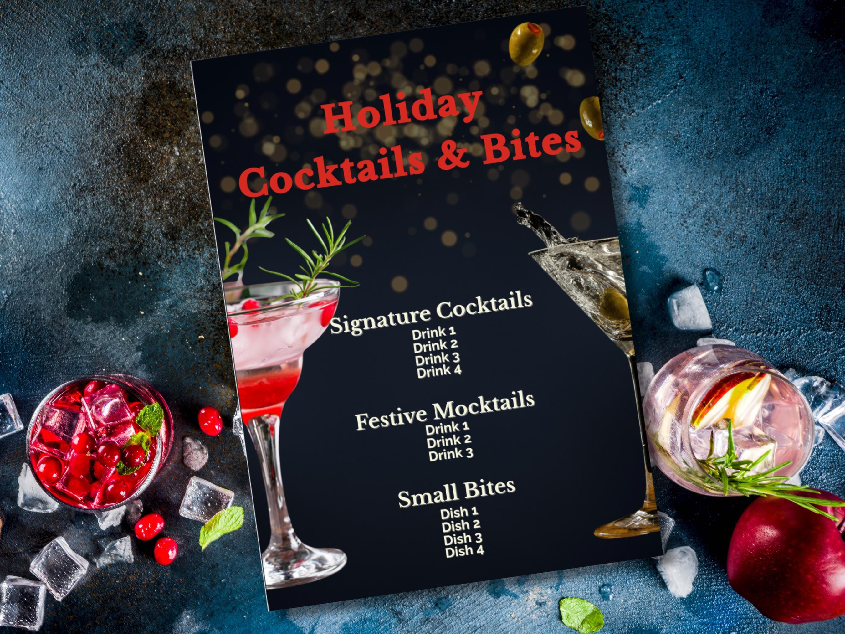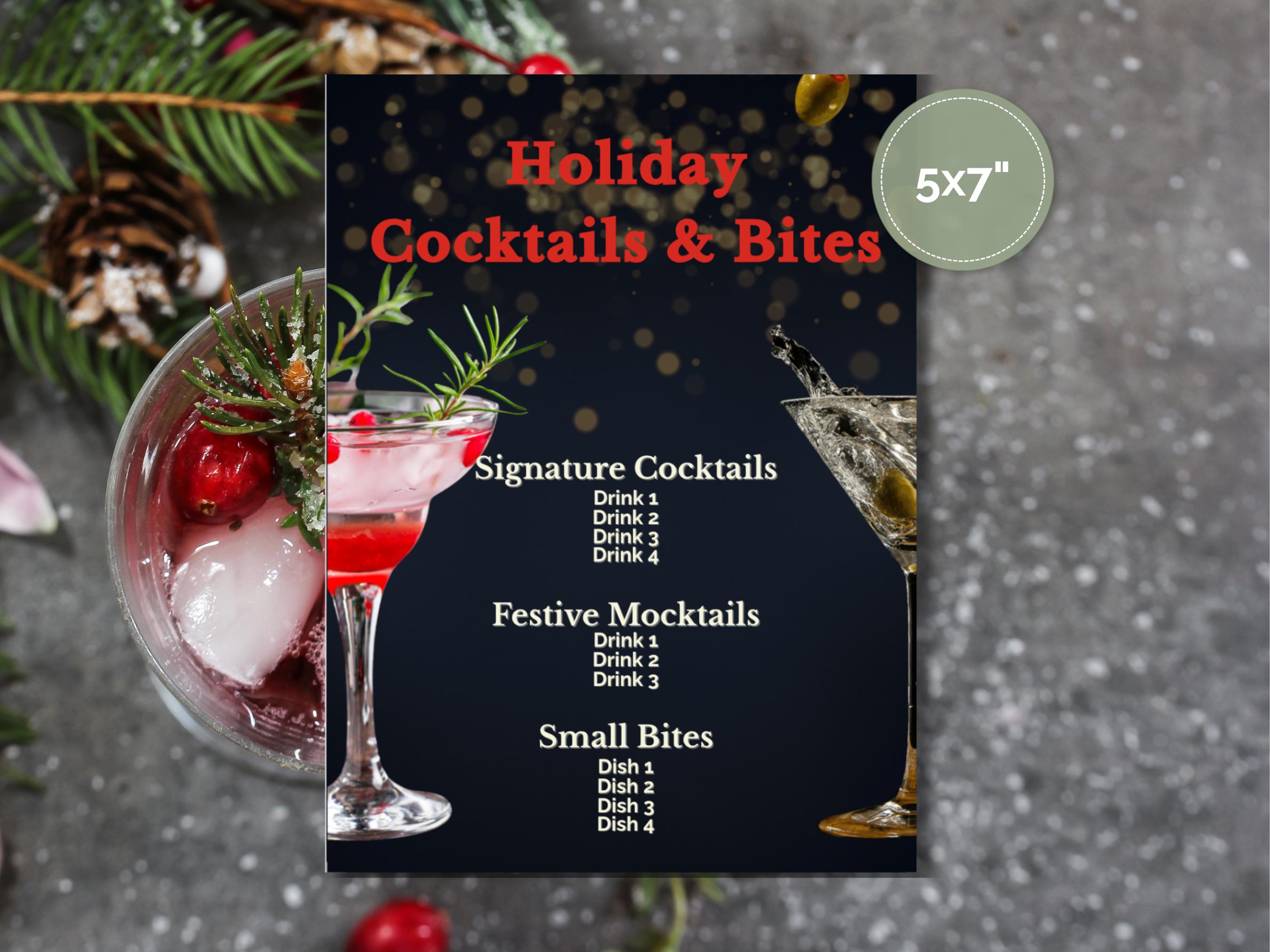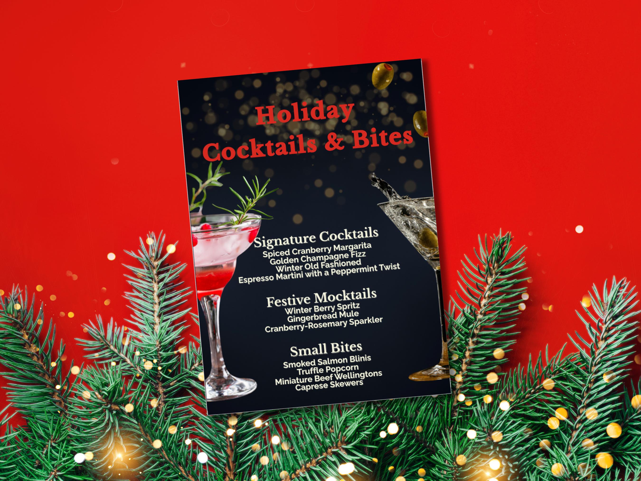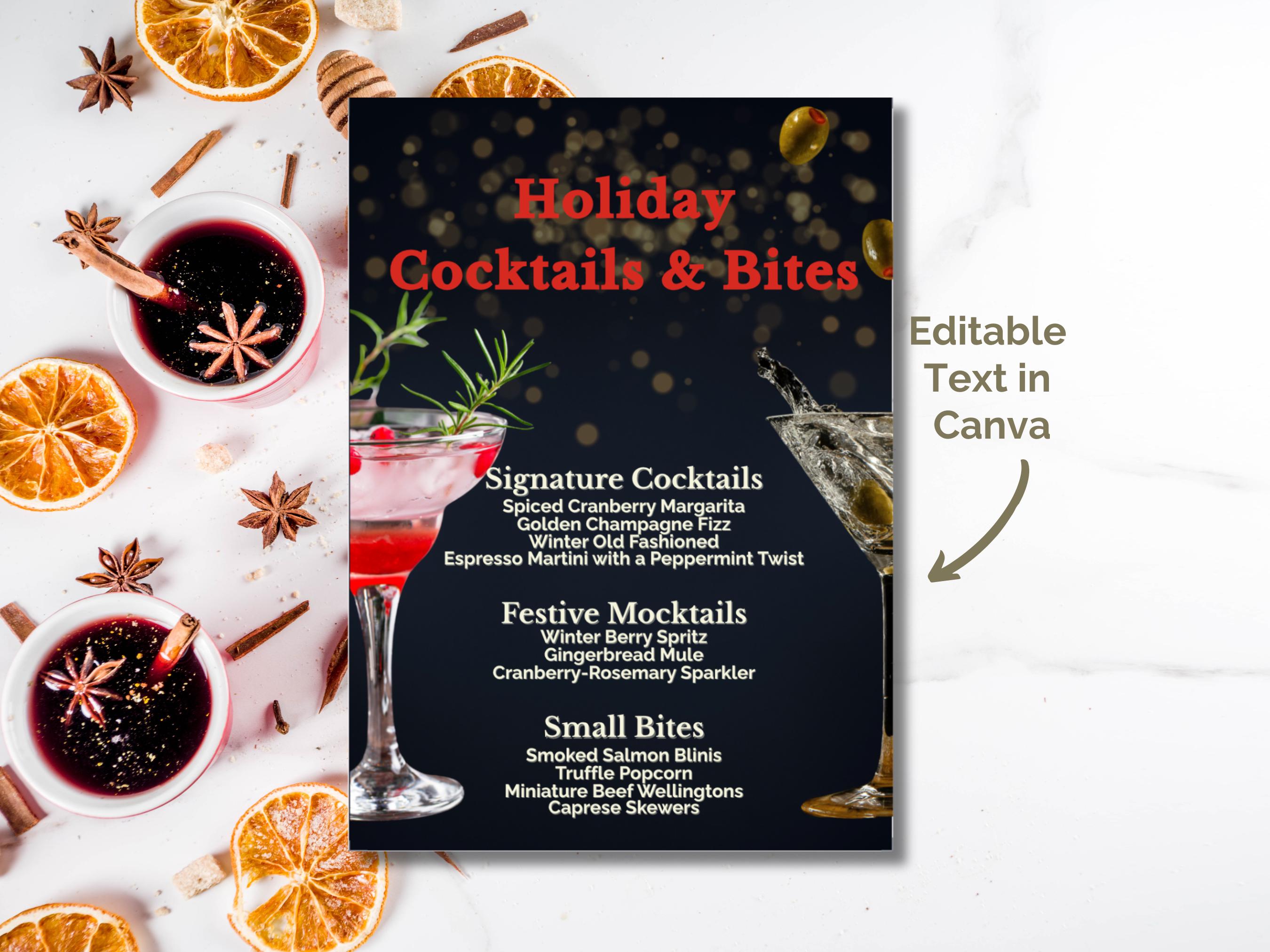 🎁 What’s Included: Editable Canva Template: Customize your menu with ease—no design skills required! Sophisticated Design: A luxurious dark background with festive golden accents and elegant fonts. Organized Layout: Sections for Signature Cocktails, Festive Mocktails, and Small Bites—fully customizable to suit your menu.