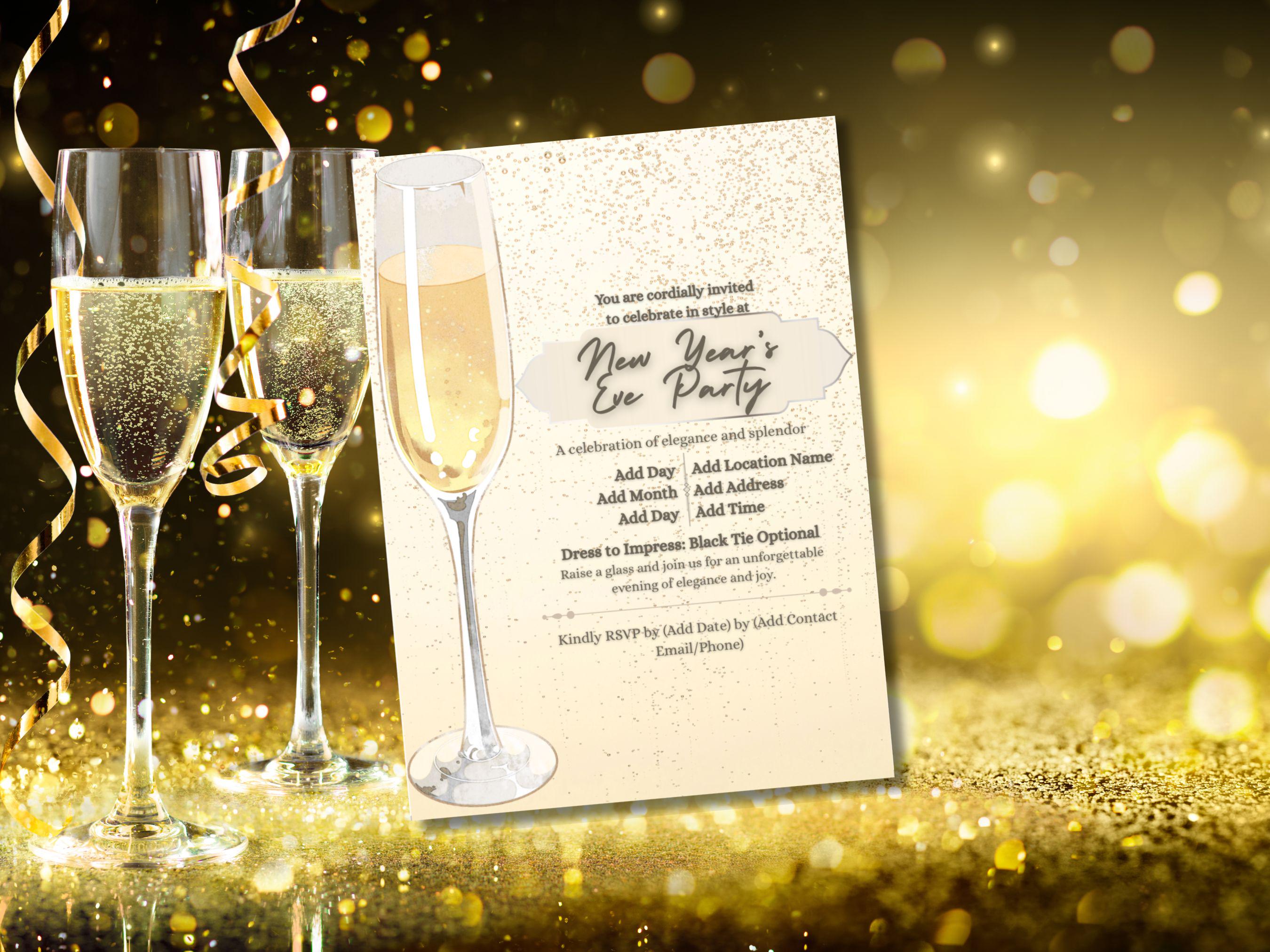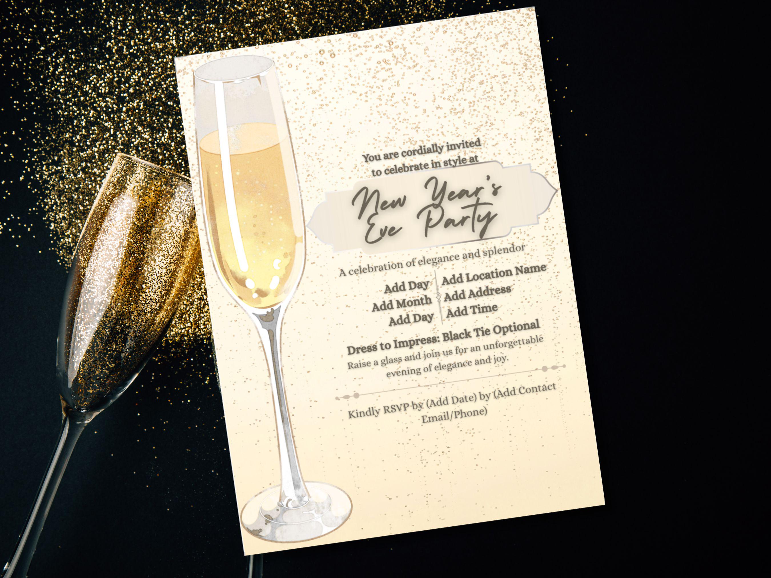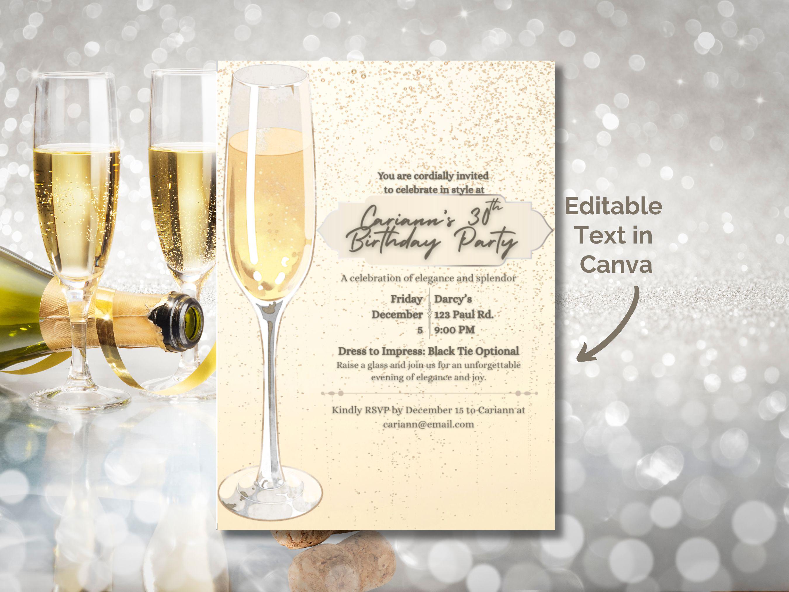 Features Elegant champagne flute and gold glitter accents for a celebratory, sophisticated look Fully editable text—update event name, date, time, location, and RSVP details to fit your party Versatile design for weddings, engagement parties, birthdays, holiday gatherings, and galas Digital template—download instantly after purchase Flexible use—print at home or send to guests digitally