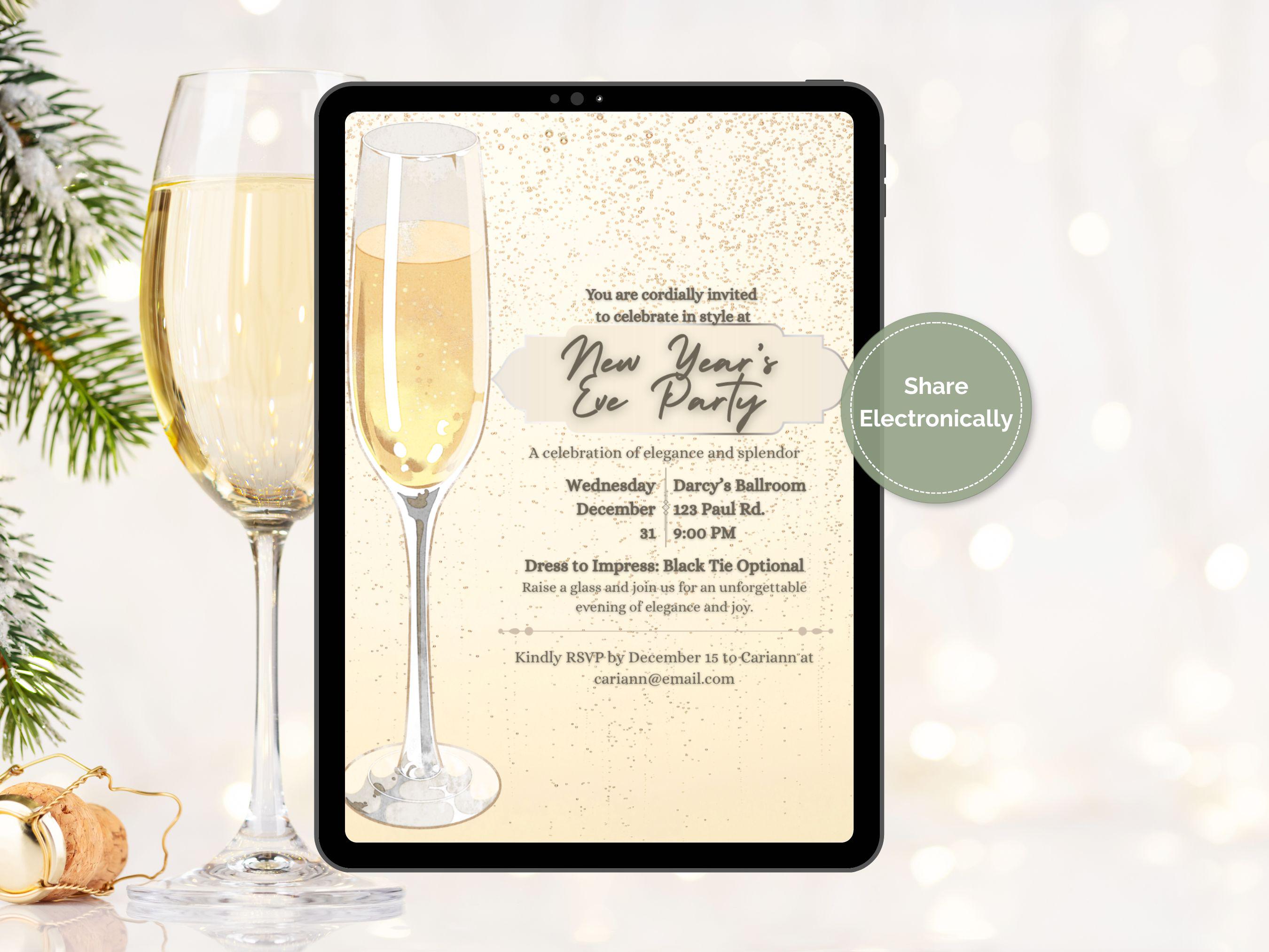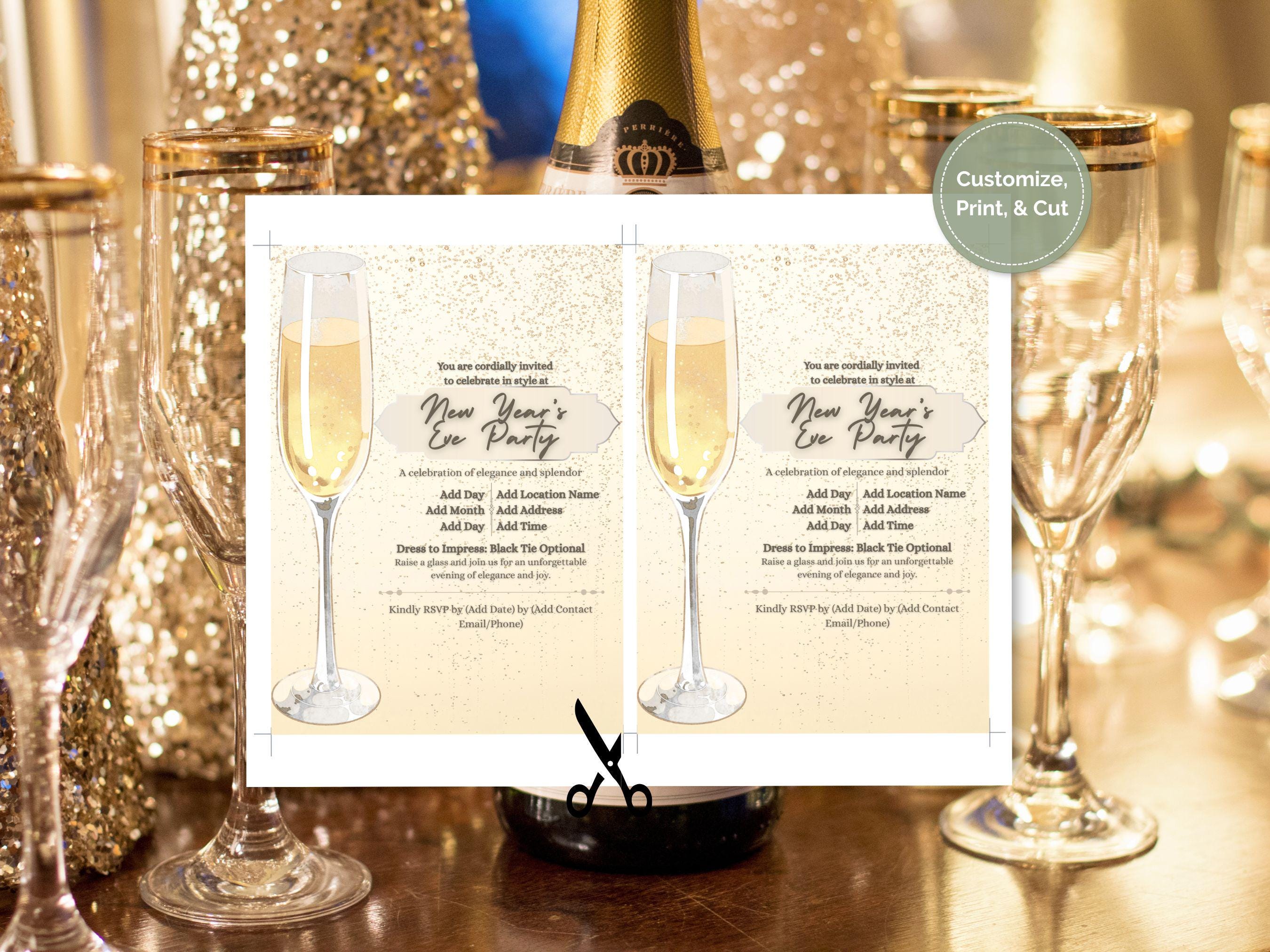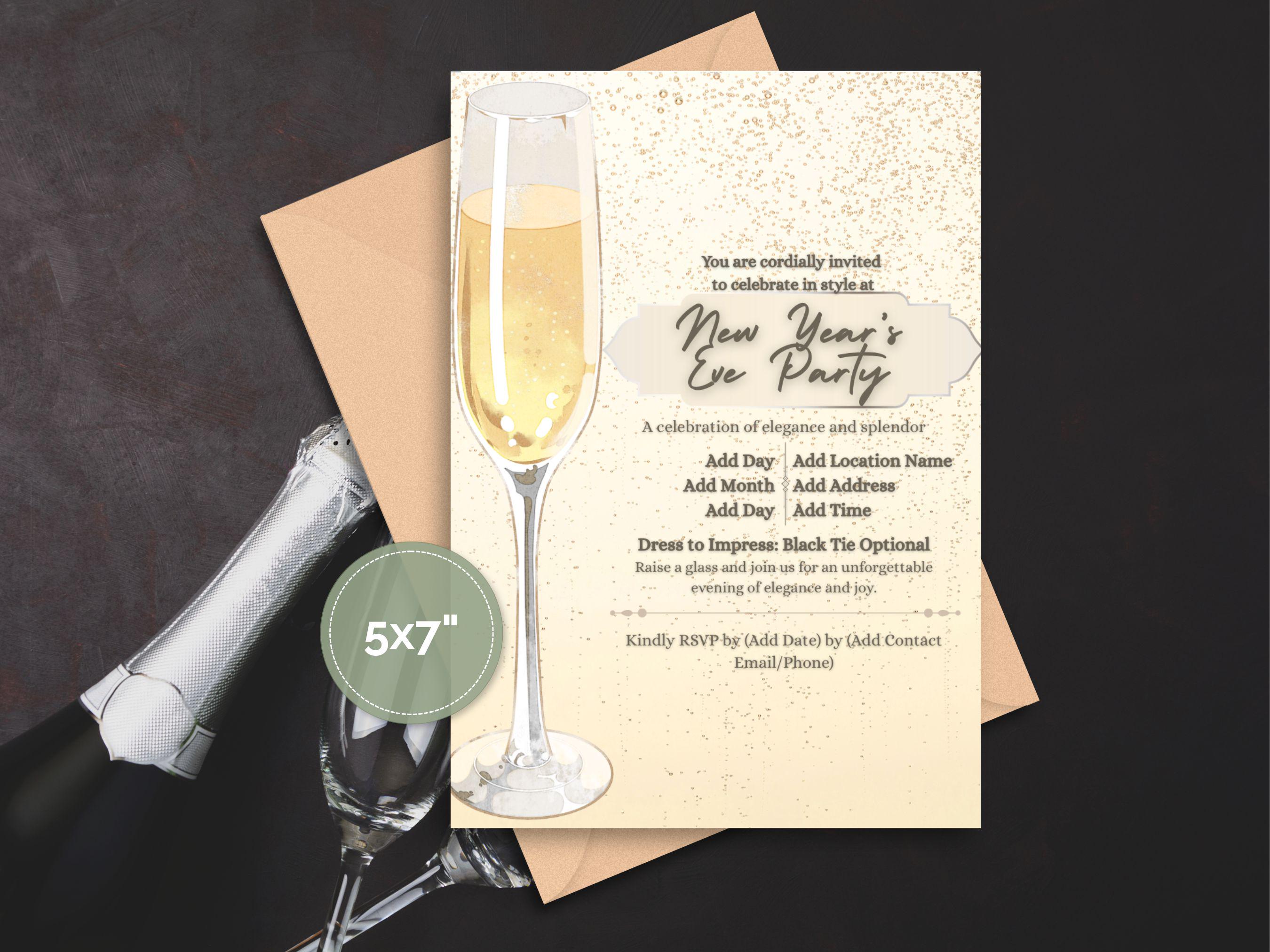 Features Elegant champagne flute and gold glitter accents for a celebratory, sophisticated look Fully editable text—update event name, date, time, location, and RSVP details to fit your party Versatile design for weddings, engagement parties, birthdays, holiday gatherings, and galas Digital template—download instantly after purchase Flexible use—print at home or send to guests digitally