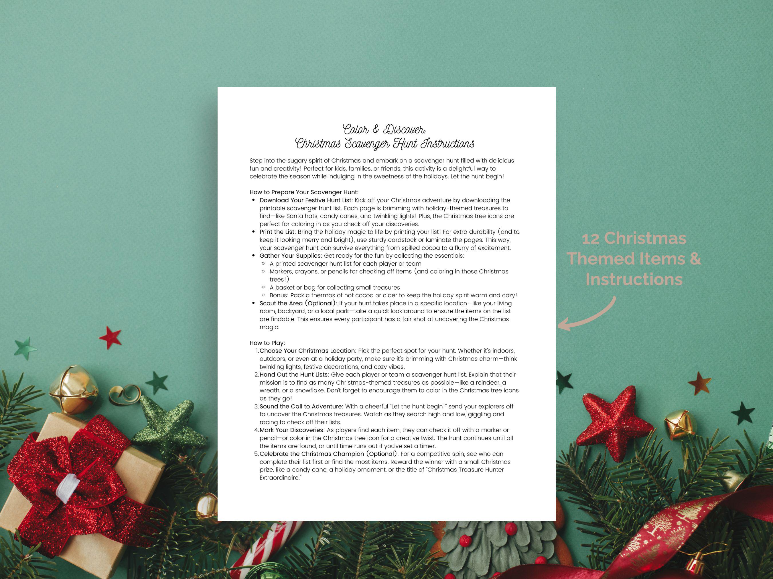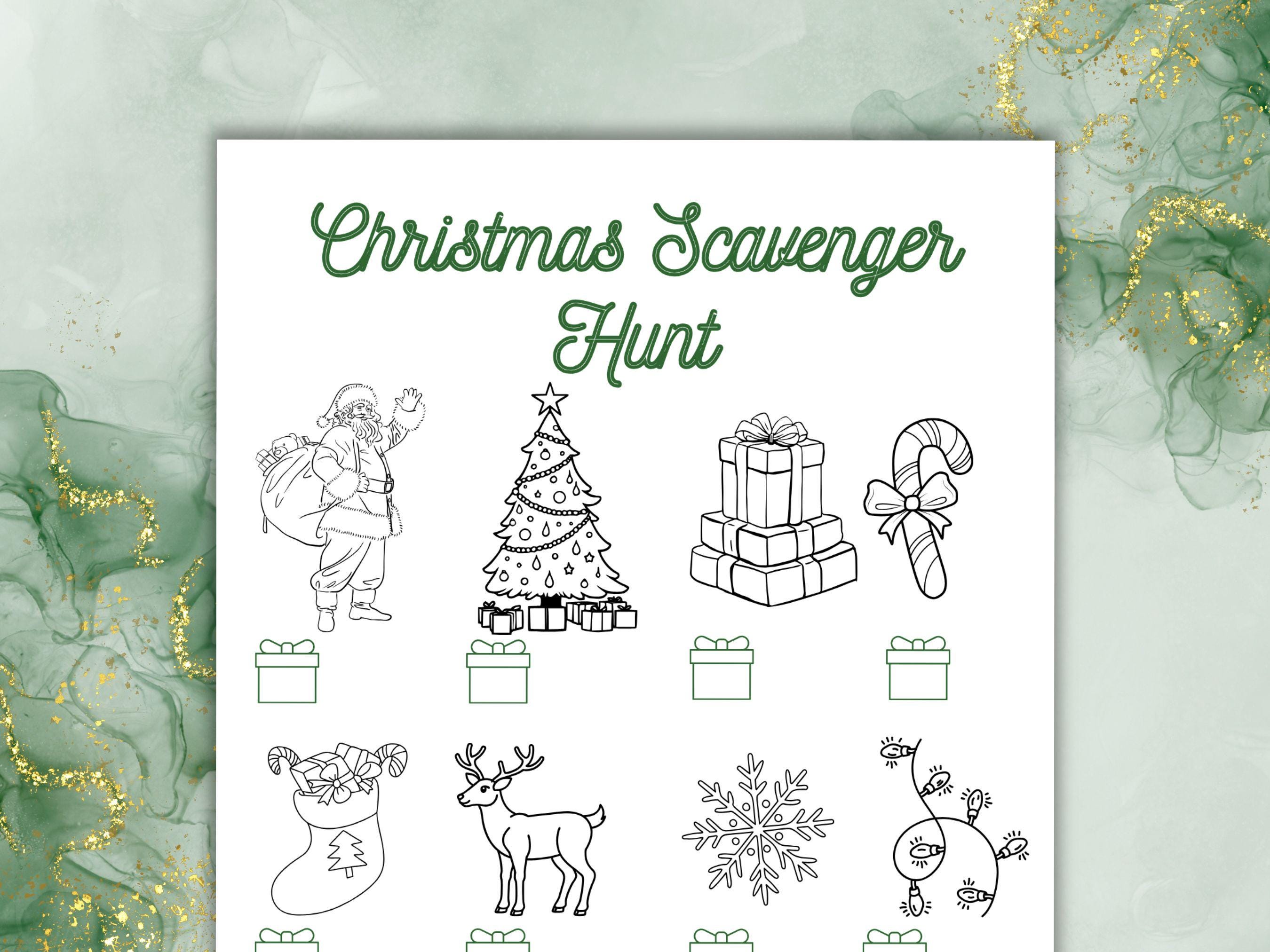 What You'll Get Instant Digital Download 📥: Receive your high-quality 8.5x11" PDF files immediately after purchase. No waiting for shipping!- Printable Scavenger Hunt Sheet 🖍️ 🖍️: Features 12 charming, hand-drawn Christmas illustrations ready to be found and colored. Complete Instructions Page 📜 📜: Easy-to-follow guide on how to prepare and play, ensuring a smooth and fun experience for everyone.