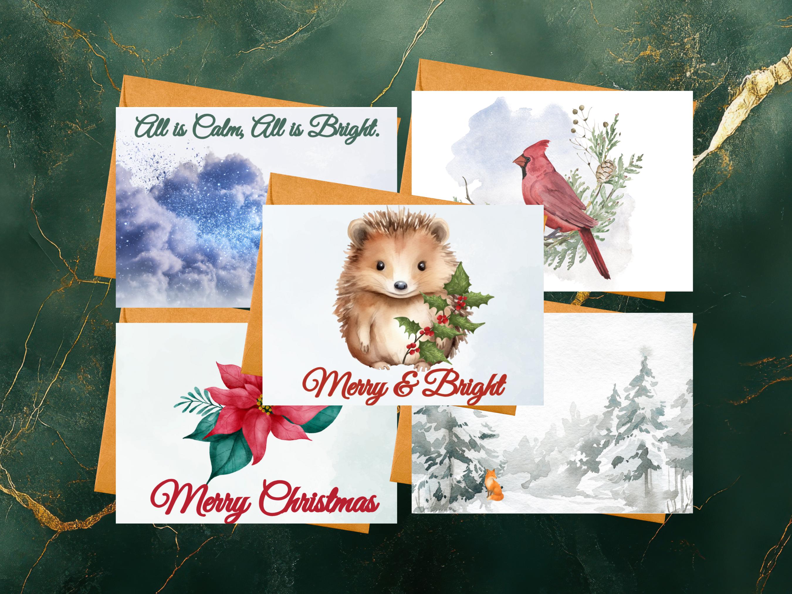 🌟 What’s Included? 20 unique card designs featuring: 🌲 Snowy forests, cabins, and lakes 🦊 Whimsical winter animals like foxes, hedgehogs, and polar bears 🌺 Festive florals like poinsettias, holly, and mistletoe ❄️ Sparkling snowflakes and Northern Lights scenes High-resolution PDF files (300 DPI) for easy printing at home or with a professional printer.