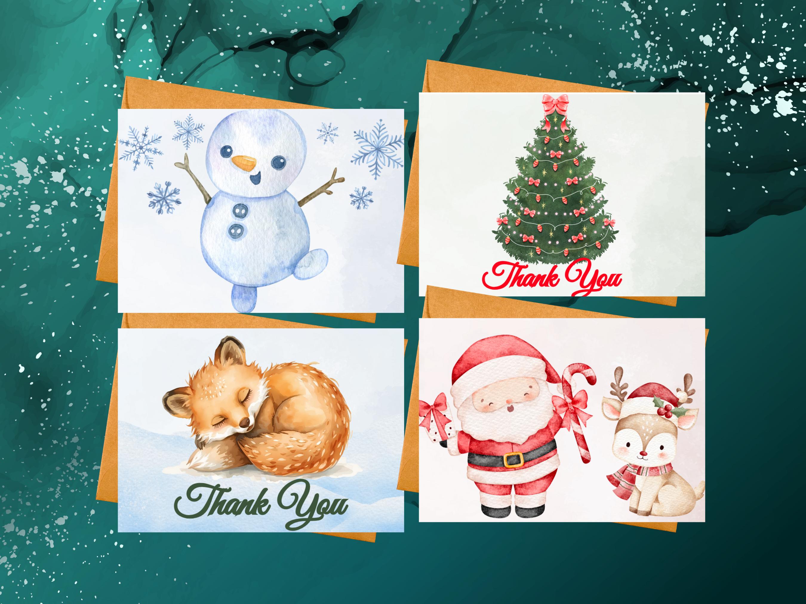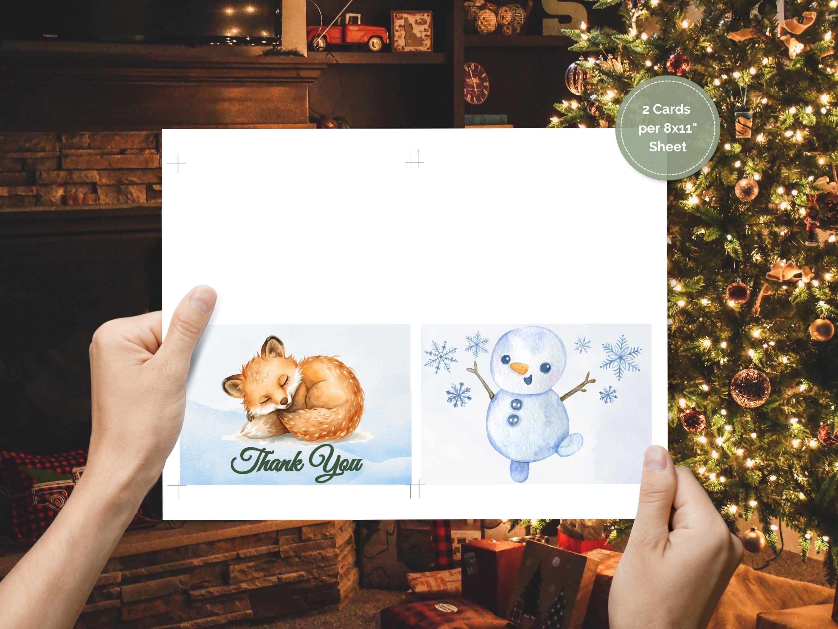 🌟 What’s Included: 4 unique designs featuring: 🦊 A cozy, sleeping fox on a snowy background ⛄ A cheerful snowman surrounded by snowflakes 🎅 Santa Claus with a reindeer and festive details 🎄 A beautifully decorated Christmas tree High-resolution PDF file (8.5" x 11") with 2 cards per page for easy printing ✂️ 🎨 Why You’ll Love These Cards: Versatile: Perfect for holiday thank-you notes, small business inserts, or winter celebrations. Eco-Friendly: Print as many as you need at home or at your favorite print shop! 🌍 Charming Designs: Hand-painted watercolor illustrations for a whimsical, festive touch.