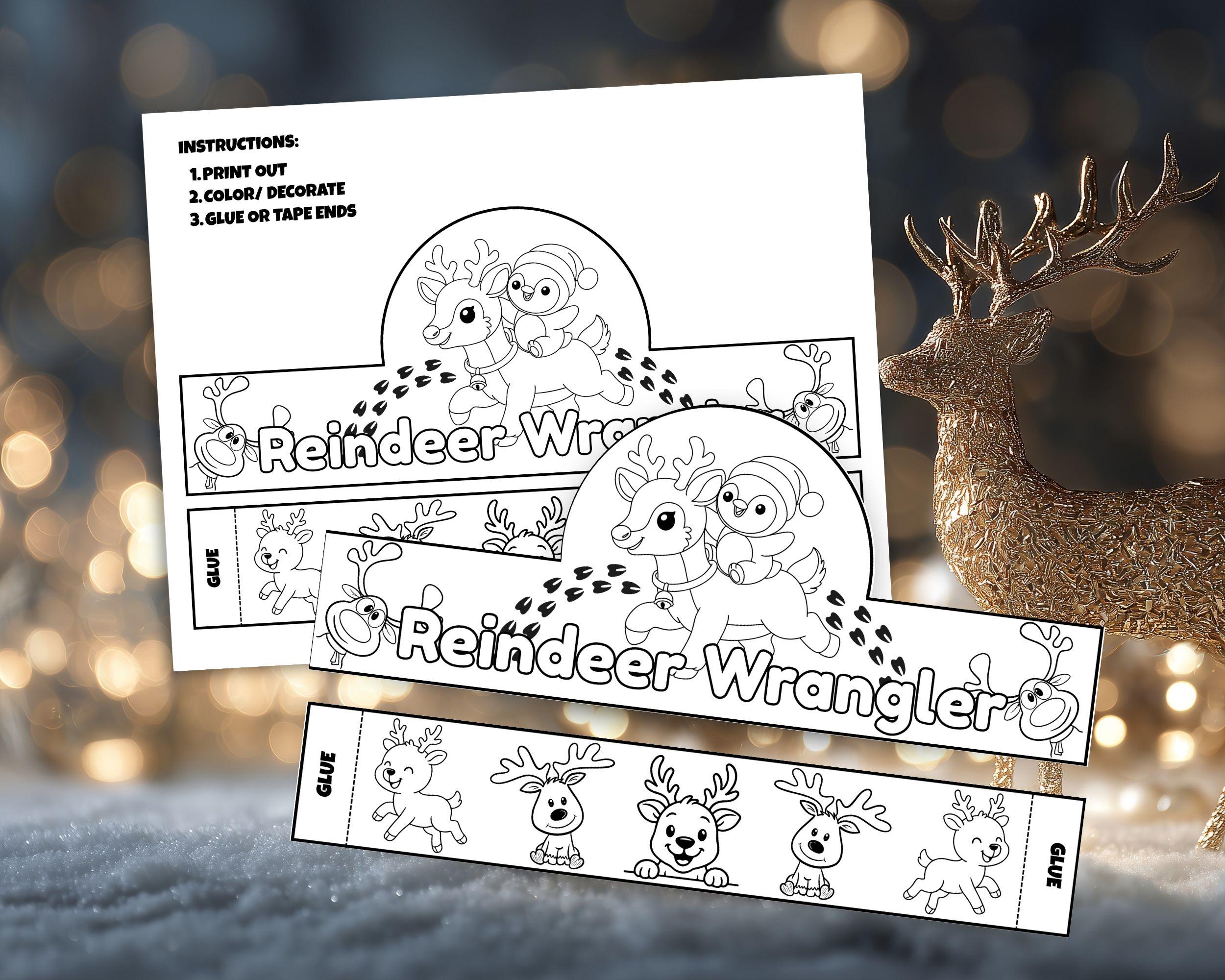 What You'll Receive A charming, high-resolution PDF file featuring the "Reindeer Wrangler" crown. The design is filled with cute, ready-to-color illustrations of playful reindeer and a friendly penguin. 🐧 Adjustable bands are included to ensure a perfect fit for every little wrangler.