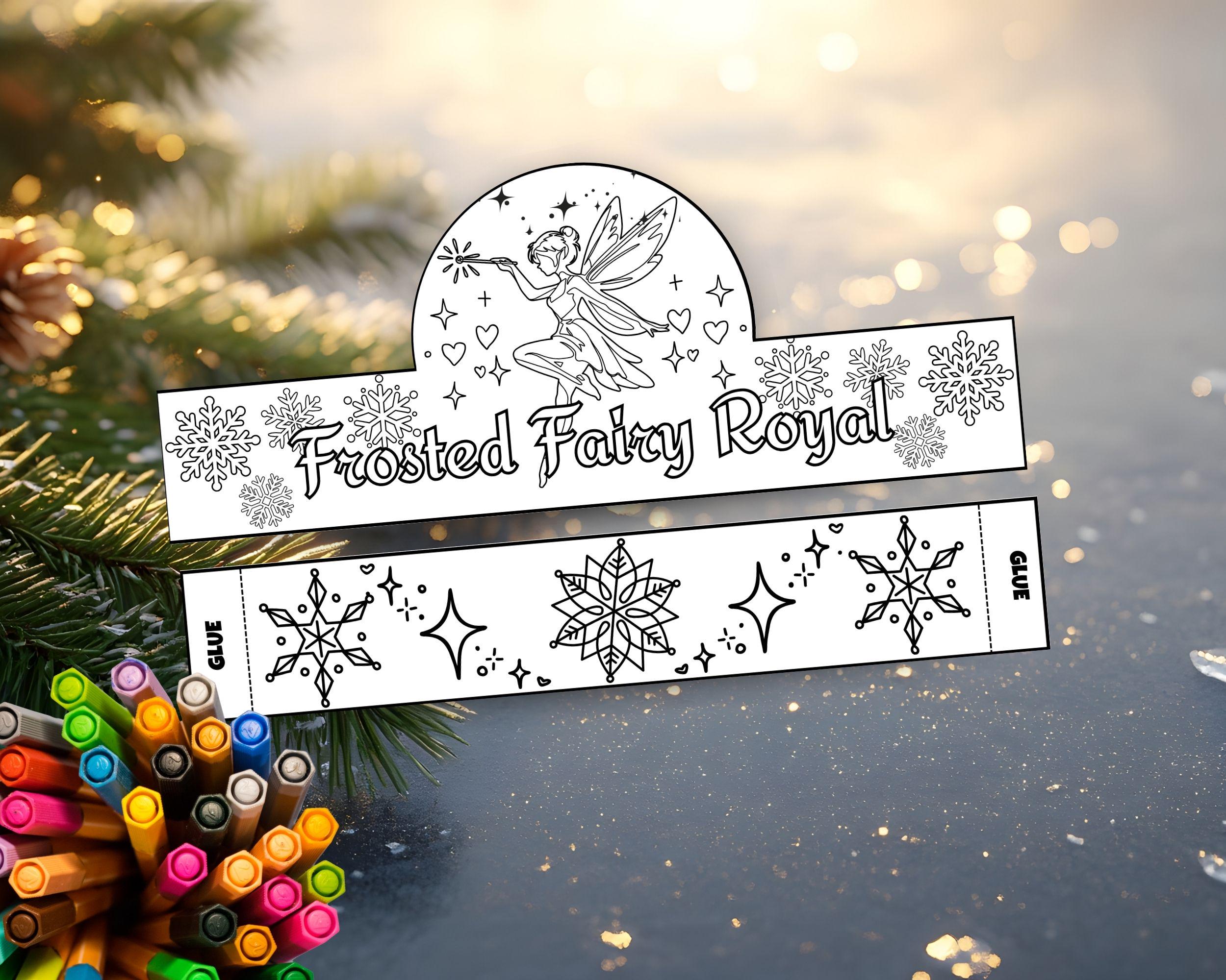 ❄️ What’s Included: A printable PDF template featuring a whimsical fairy and intricate snowflakes. Easy-to-follow instructions for printing, coloring, and assembling. A beautifully designed crown band with snowflake and star patterns.