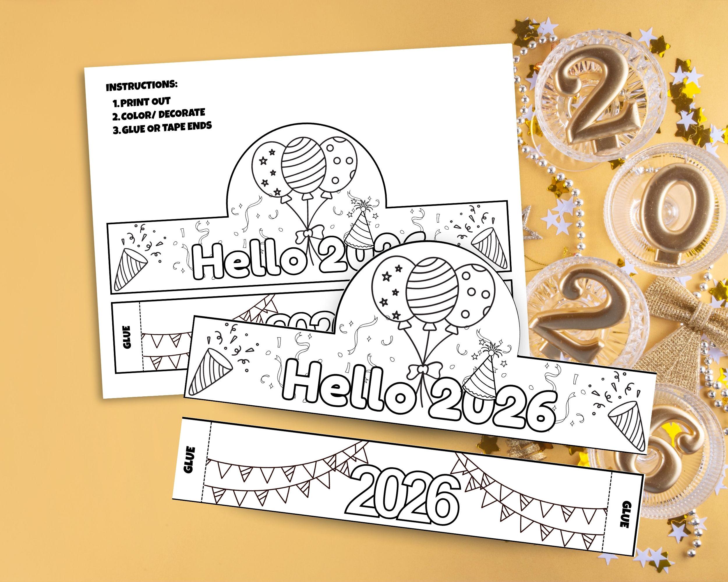 A festive "Hello 2026" crown template featuring balloons, party hats, bunting, and confetti! Easy-to-follow instructions for printing, coloring, and assembling. How It Works: 1️⃣ Download the PDF instantly after purchase. 2️⃣ Print it out on standard 8.5x11" paper. 3️⃣ Let the kids color and decorate with crayons, markers, glitter, or stickers! 🎨✨ 4️⃣ Assemble the crown by gluing or taping the ends together.