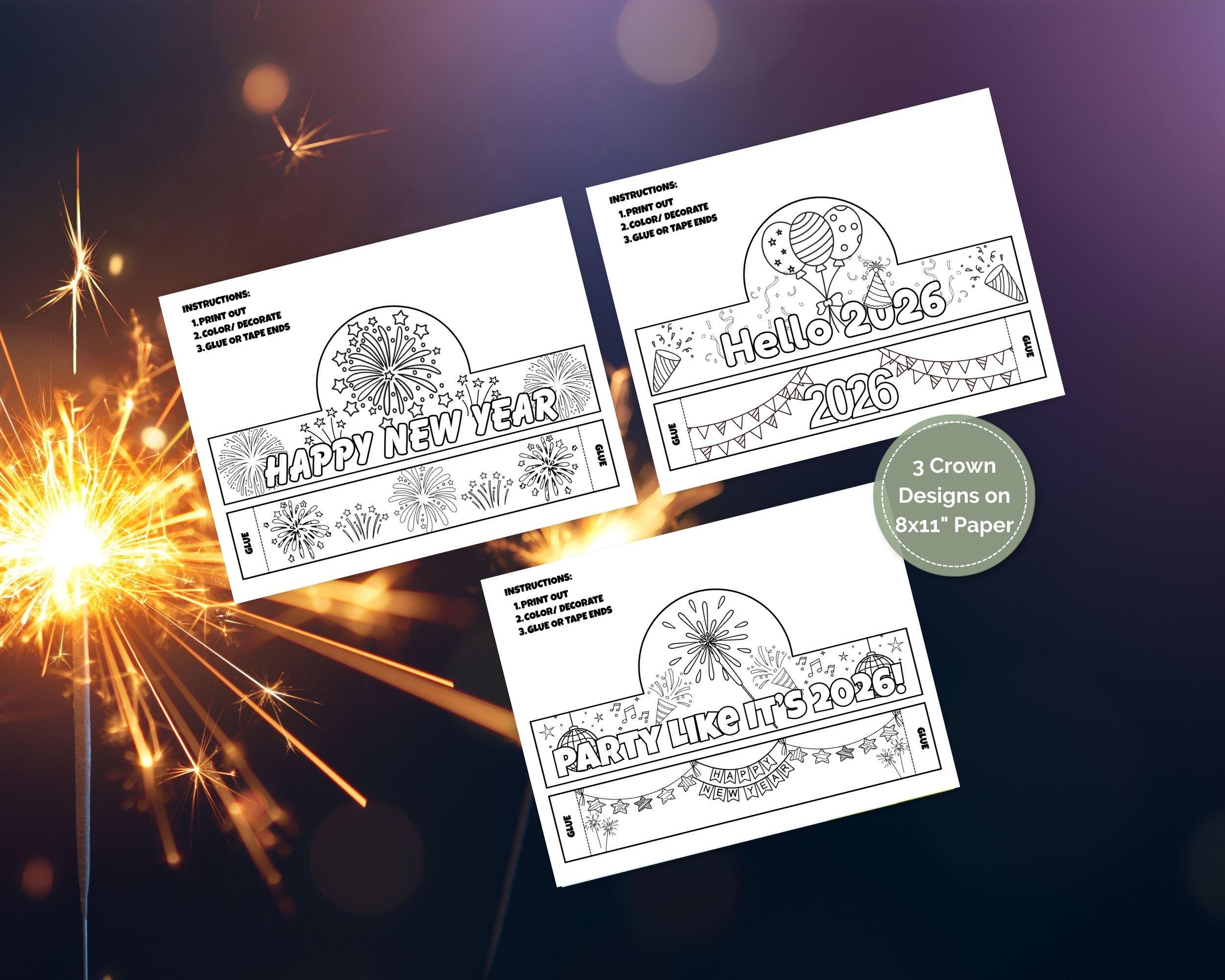 Make your New Year’s Eve celebration unforgettable with this printable party crown bundle! Perfect for kids to color, decorate, and wear as they ring in 2026. This bundle includes three festive crown designs that are sure to bring creativity and fun to your NYE party, classroom, or family celebration! 🥳