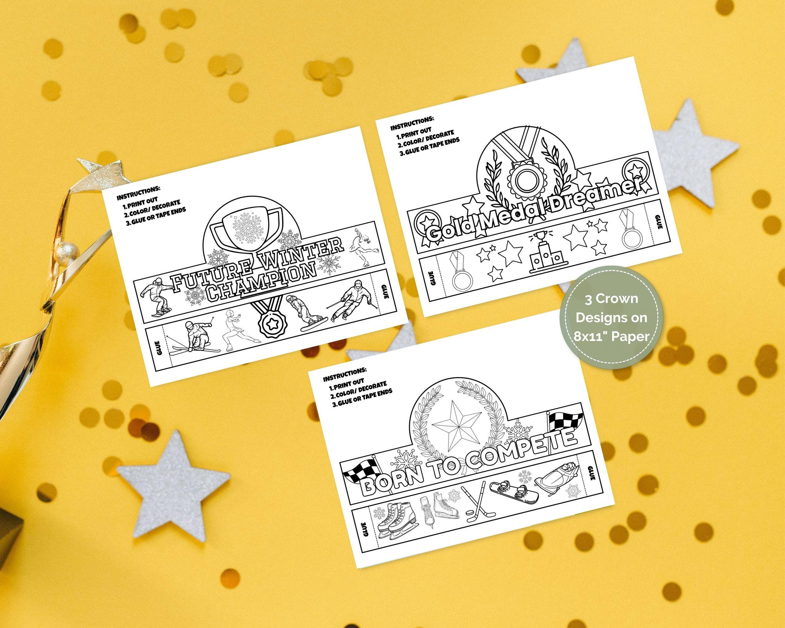 What's Included In Your Bundle 📝 This listing is for an instant digital download. No physical items will be shipped. You will receive: 3 High-Resolution PDF Files: Each file contains a unique crown template ready for printing. Gold Medal Dreamer Crown: Perfect for celebrating any achievement with medals, stars, and a podium. Future Winter Champion Crown: Features a trophy and winter-themed elements for seasonal fun. Born to Compete Crown: Packed with winter sports graphics like hockey, snowboarding, and ice skating for the ultimate competitor. Format: Black and white outlines, perfect for coloring. Size: Designed to print on standard 8.5" x 11" (Letter) paper.'