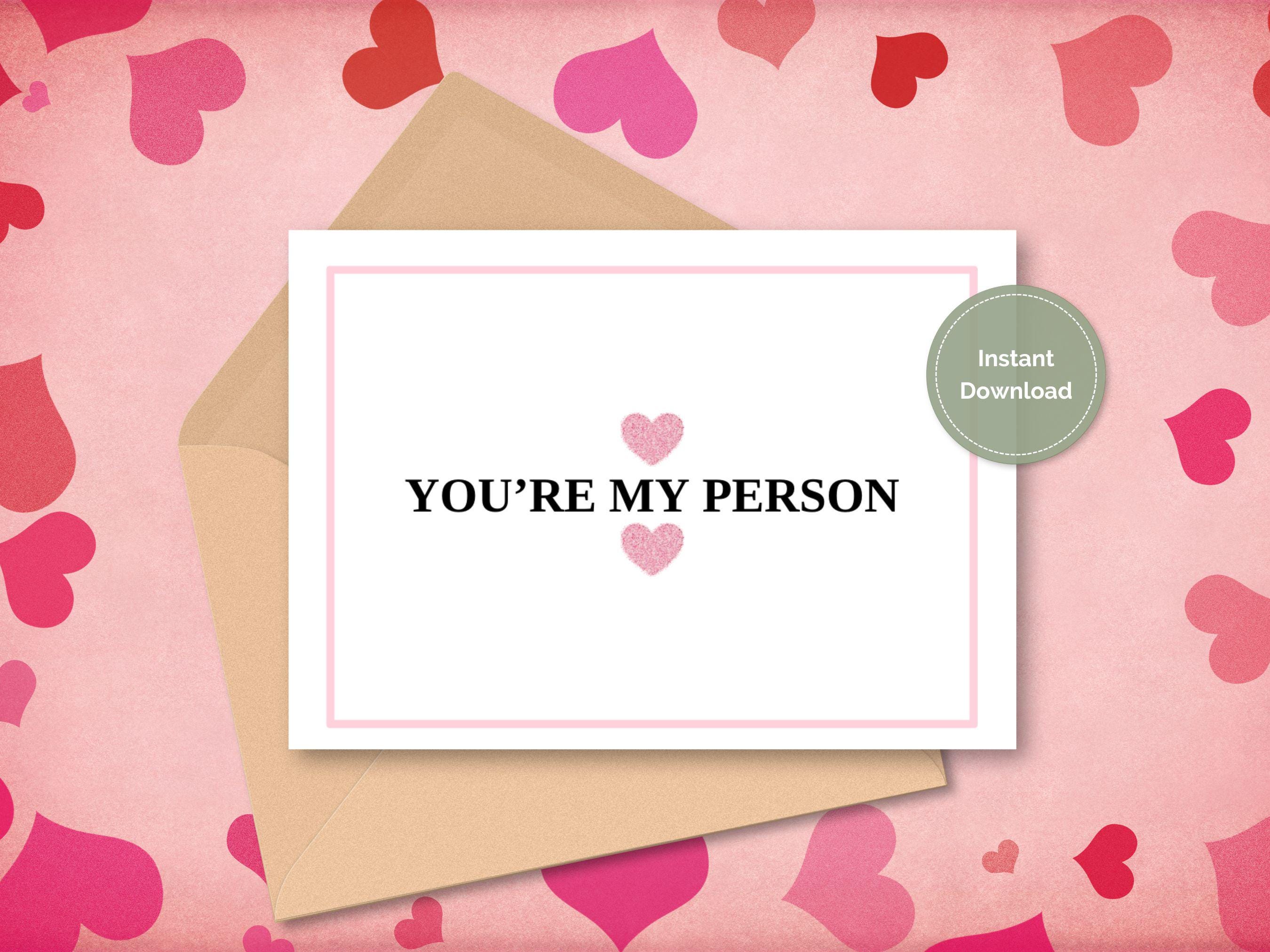What's Included ✨ This listing is for a high-quality digital download. You will receive one file containing both card designs: 1 PDF File (8.5" x 11"): Designed for easy printing on standard letter-sized paper or cardstock. Two Unique Designs: "You + Me = Forever": Features a luxurious rose gold-style border and a textured, glittery heart for a timeless romantic look. "YOU'RE MY PERSON": A heartfelt declaration framed in soft pink, accented with charming glittery hearts and bold, modern typography.