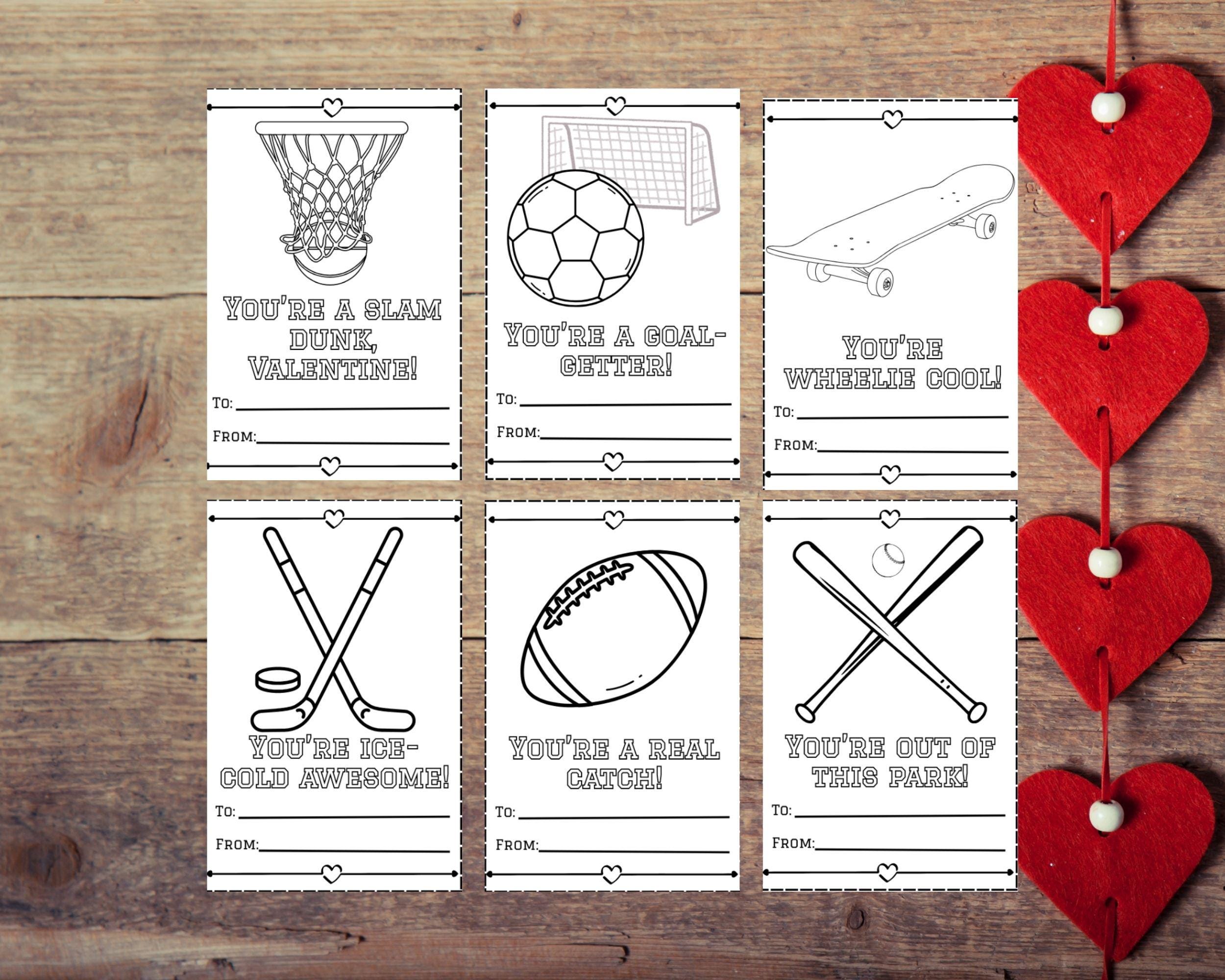The six action-packed designs include: 🏀 "You're a slam dunk, Valentine!" 🏒 "You're ice-cold awesome!" ⚾ "You're out of this park!" 🛹 "You're wheelie cool!" 🏈 "You're a real catch!" ⚽ "You're a goal-getter!"