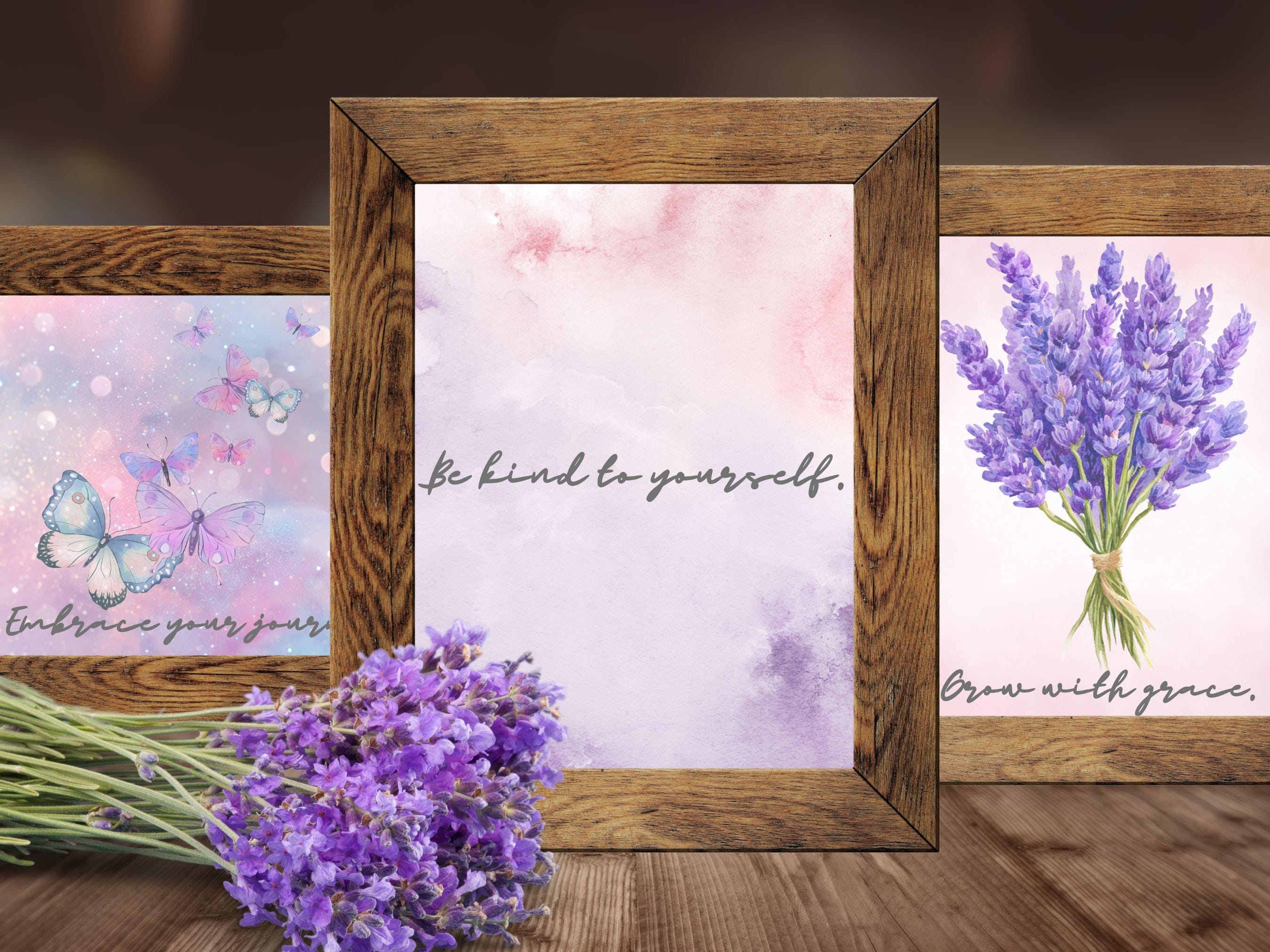 What’s Included in the Bundle This set includes three high-resolution 8x10 digital art prints, perfectly curated to work together or stand alone: 🎨 "Embrace Your Journey" Butterfly Art: A dreamy, ethereal design featuring pastel watercolor butterflies dancing against a sparkling background. 🦋 This piece symbolizes transformation and the beauty of personal growth. "Grow with Grace" Lavender Bouquet: A serene illustration of a tied lavender bouquet with a soft pink backdrop. 💐 The natural, rustic charm of this print evokes feelings of calm and patience. "Be Kind to Yourself" Affirmation: A soothing watercolor gradient fading from soft pink to deep purple, featuring a simple yet powerful handwritten reminder to practice self-compassion daily. 💜