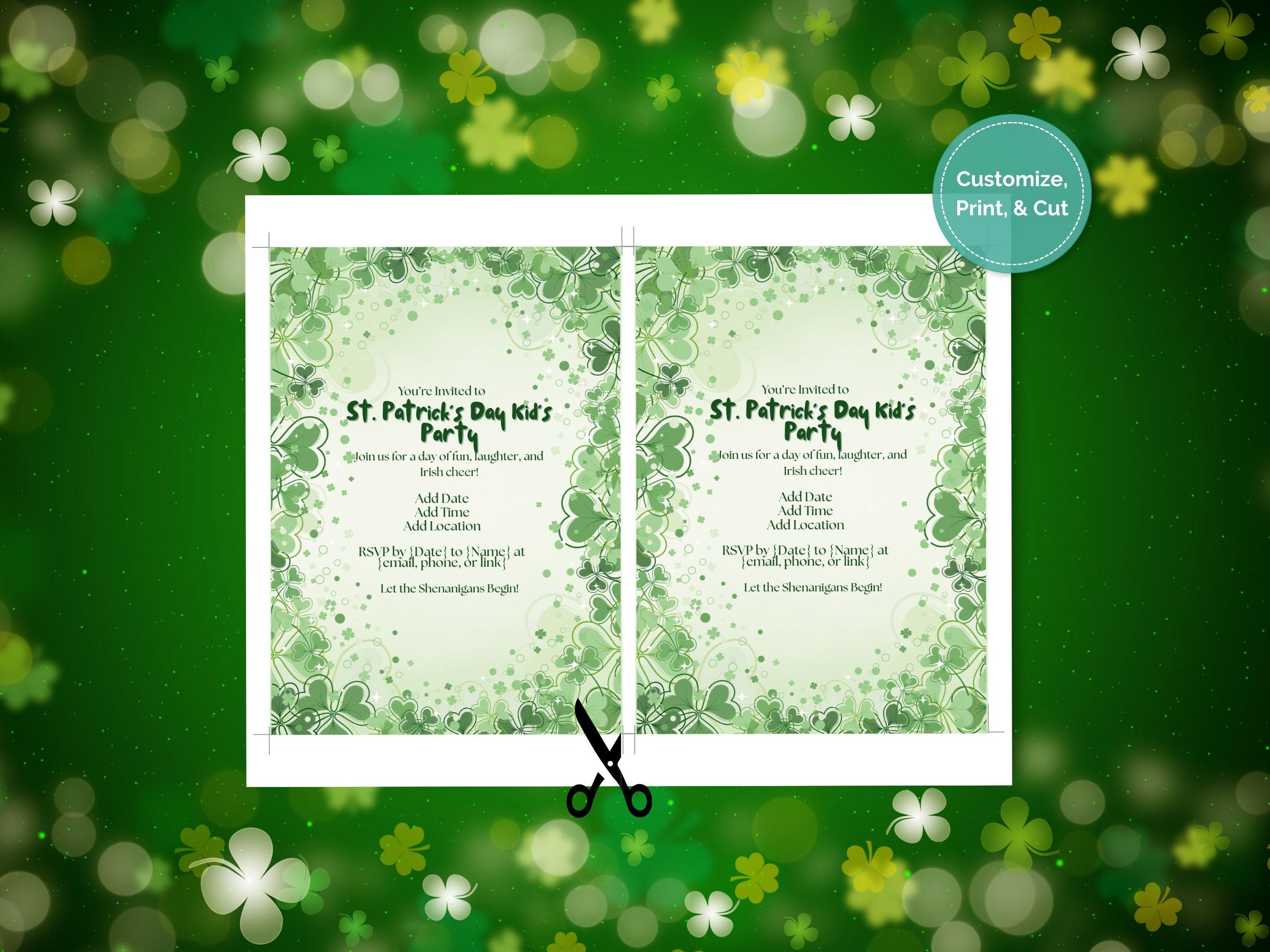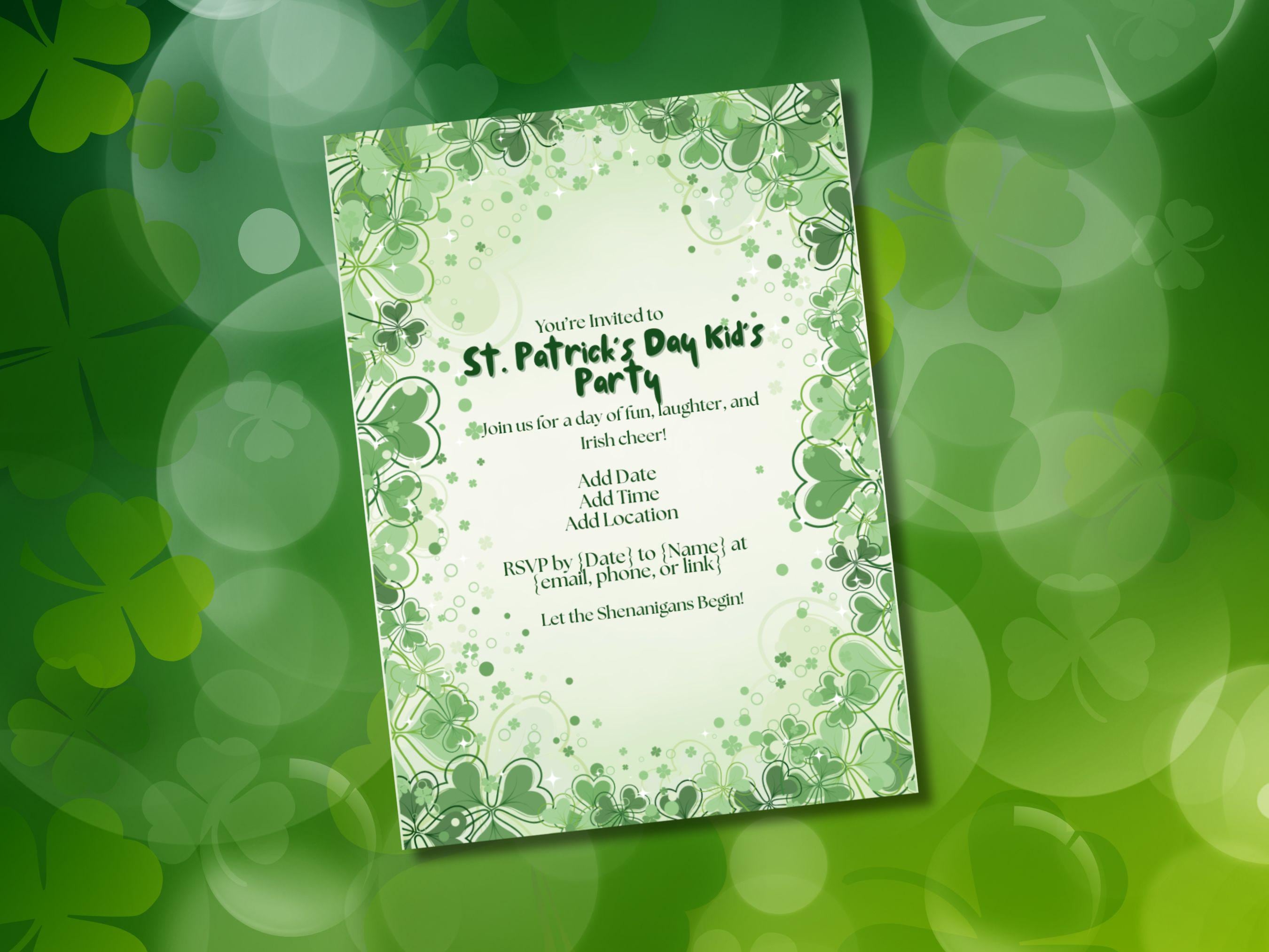 What You'll Receive This listing is for a high-resolution, printable St. Patrick's Day party invitation template. It’s an instant digital download, so you can start customizing and printing right away! No physical product will be shipped. 📨 Editable Text Fields: Easily personalize all the important details, including the date, time, location, and RSVP information. (Text is editable in Canva Free—design elements are not.) Print-Ready Format: The design is optimized for easy home printing or for sending to your favorite print shop. Charming Design: Features a festive green palette, a border of whimsical shamrocks, and a clean, organized layout that’s perfect for a kid-friendly celebration.
