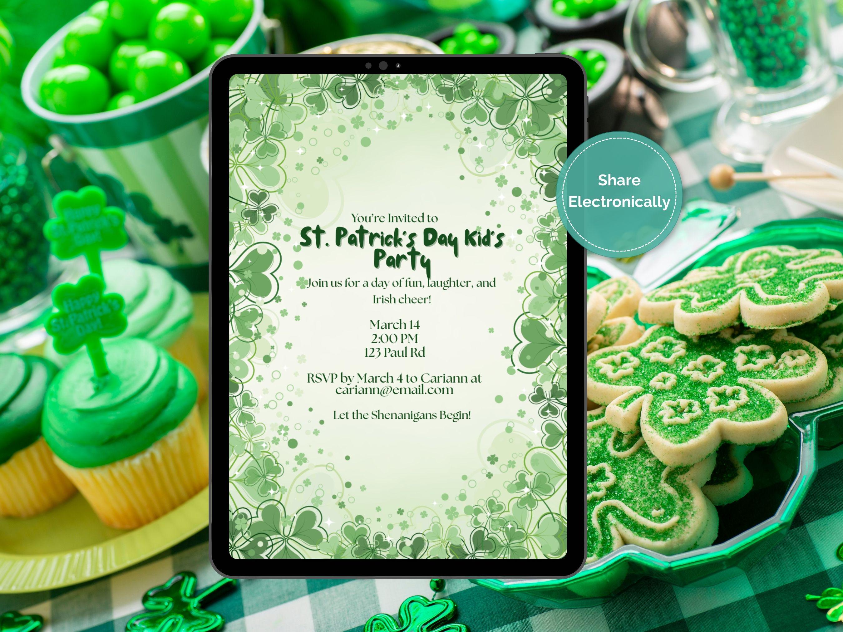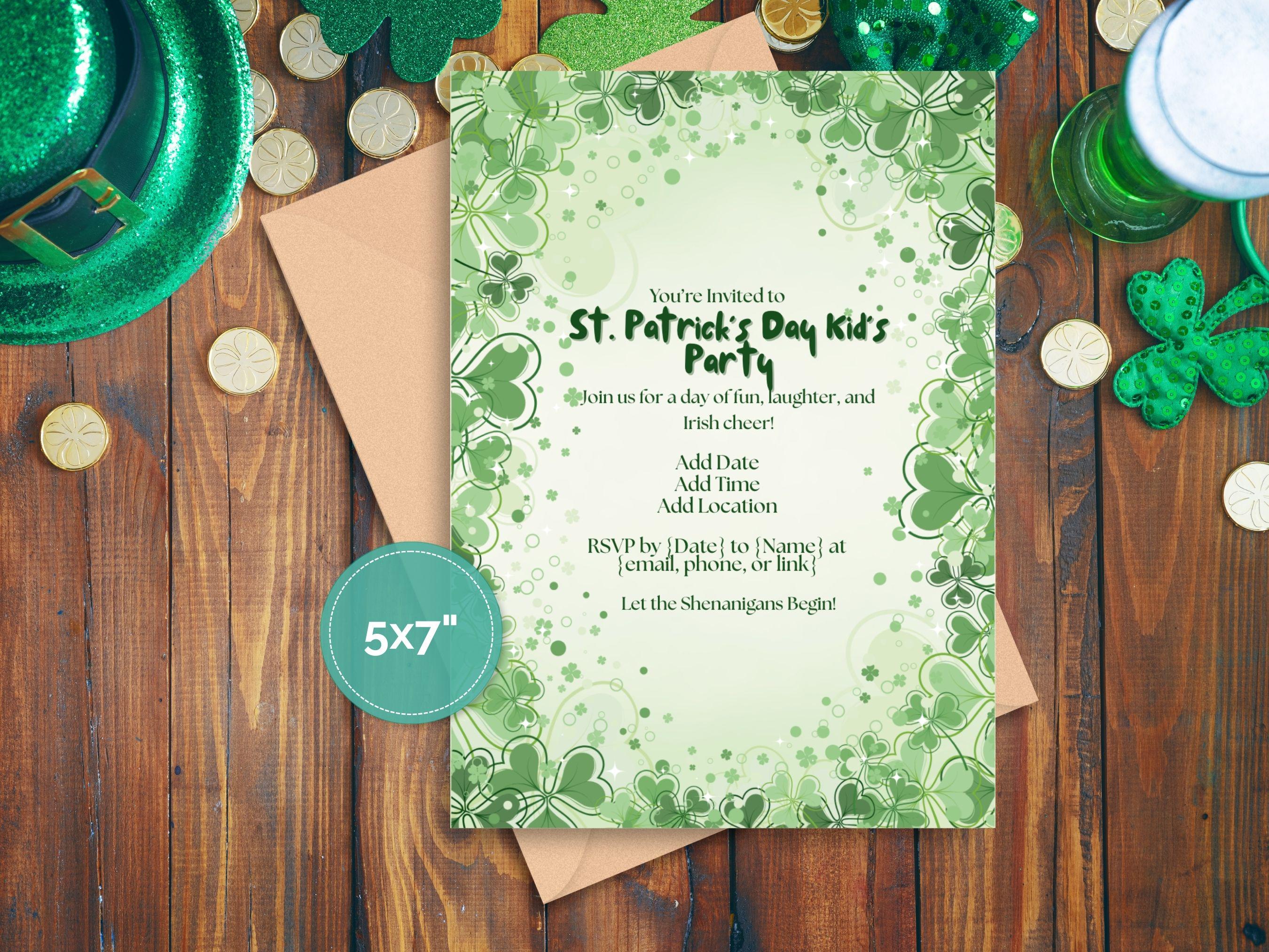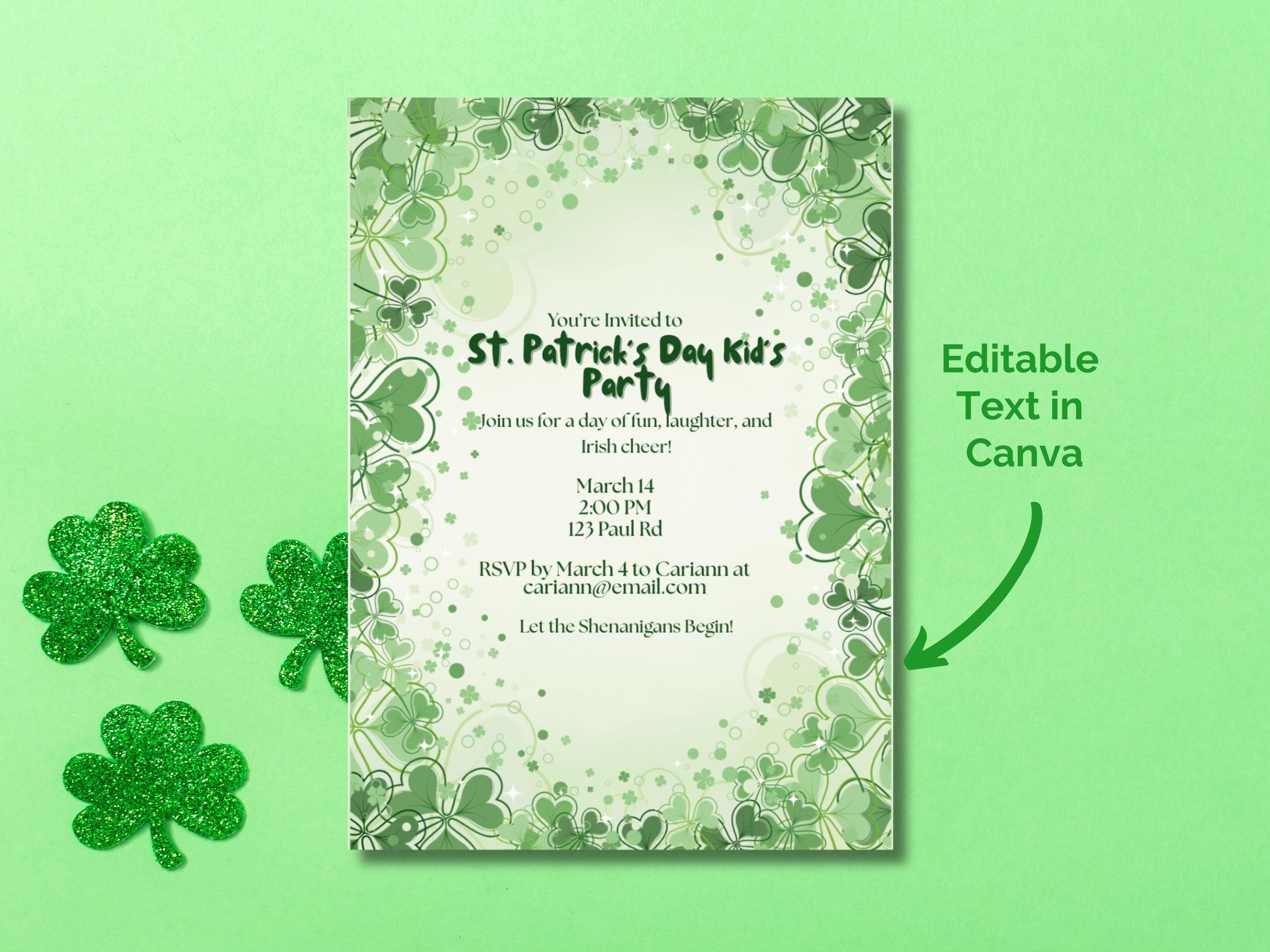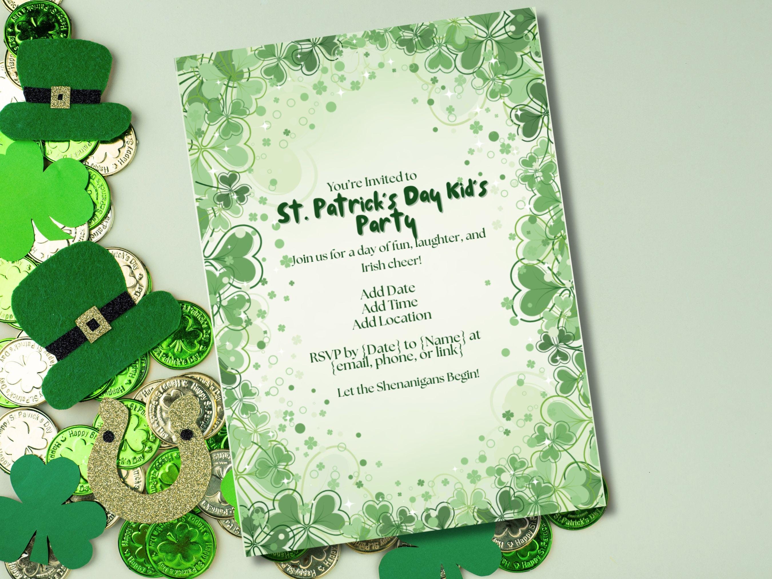 St. Patrick's Day Kid's Party Invitation | Editable Template 🍀✨ | Instant Download Get ready to host the most charming St. Patrick's Day party with our delightful and easy-to-use kids' party invitation! This editable template features a clean, minimalist design adorned with playful shamrocks 🍀, making it the perfect way to invite little ones for a day of festive fun.