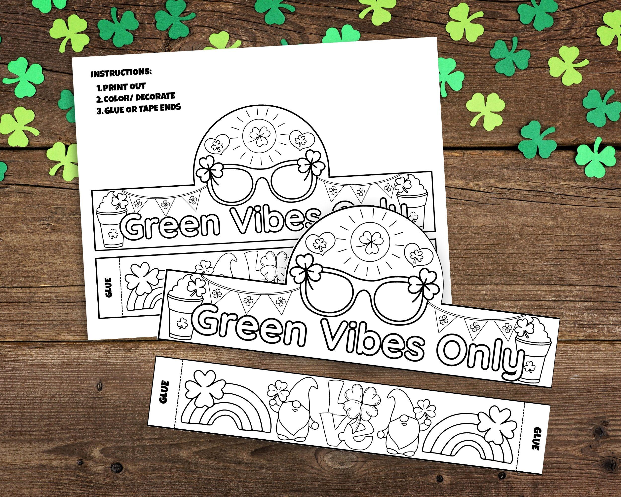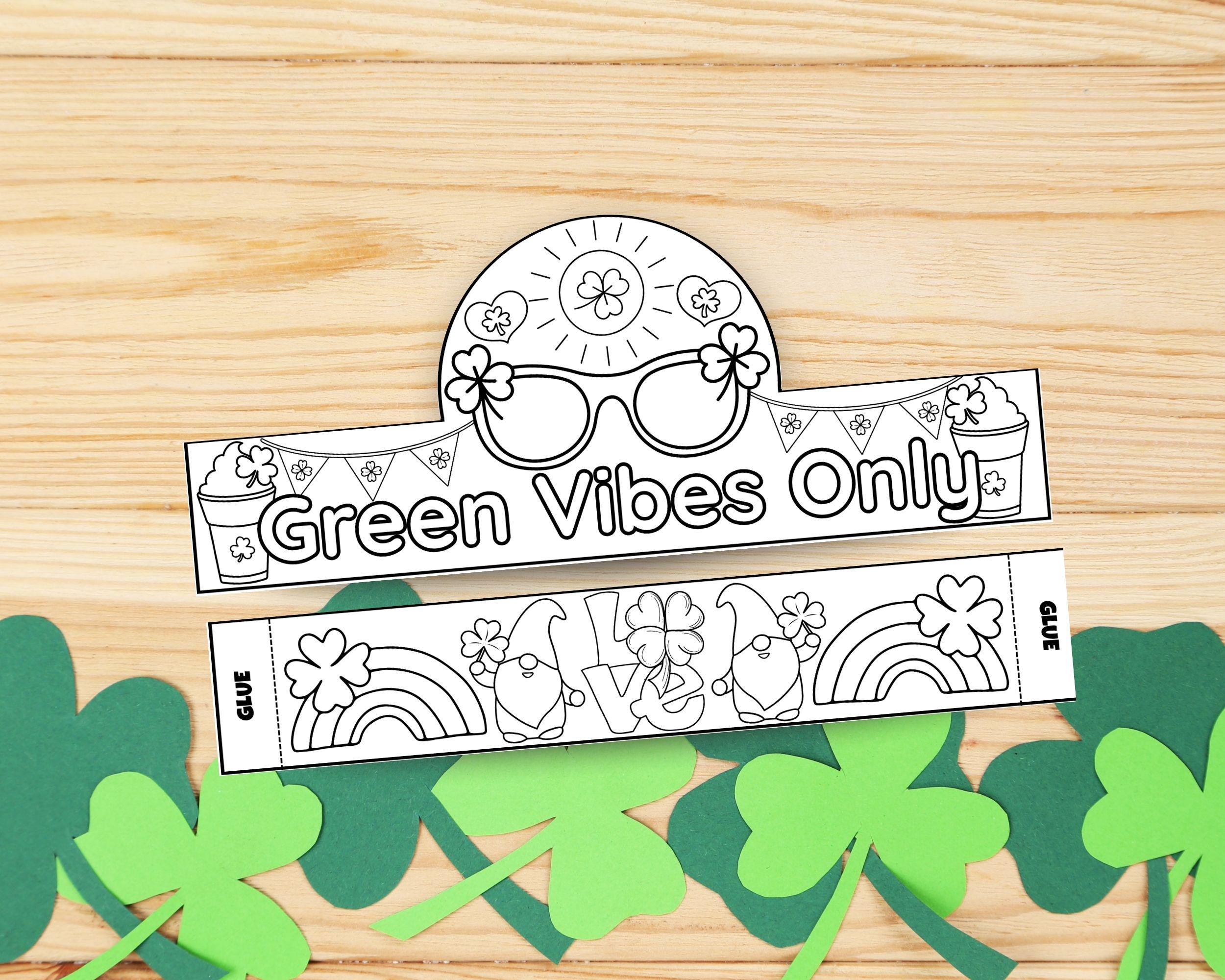 What's Included? 📂 This is an instant digital download of the "Green Vibes Only" crown template in a high-quality PDF file. Trendy Design: Features the playful phrase "Green Vibes Only," plus fun icons like sunglasses, rainbows, gnomes, and shamrocks. Coloring Fun: A detailed black-and-white outline that's perfect for crayons, markers, or colored pencils. Adjustable Fit: Includes a decorative extension band with the word "LOVE" (featuring a shamrock 'O') to ensure a perfect fit for every creative kid.