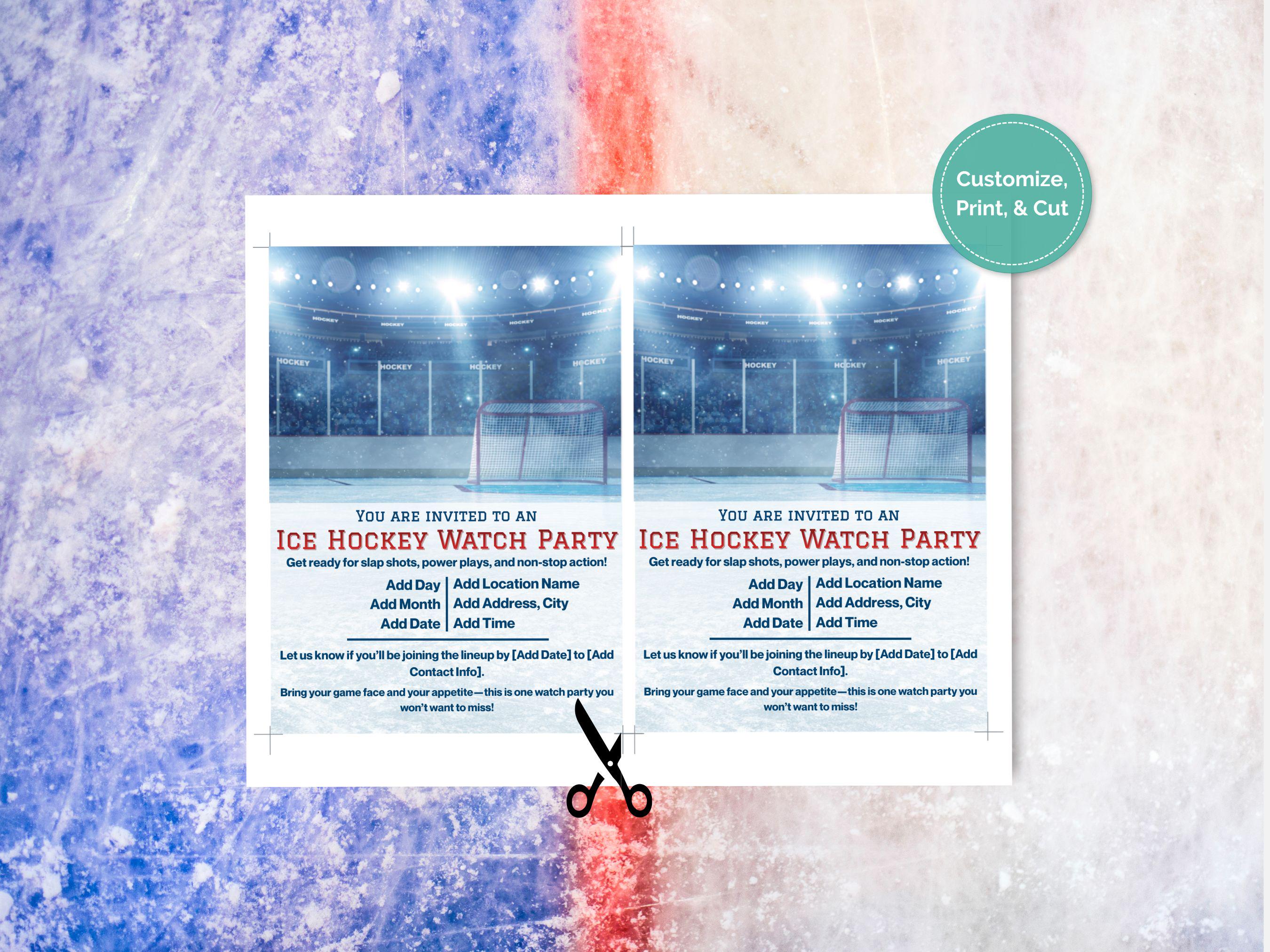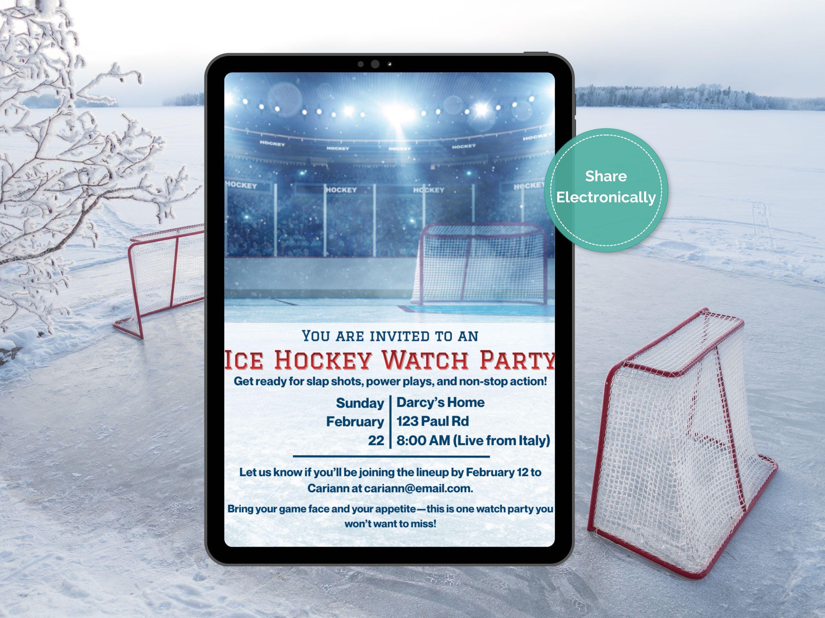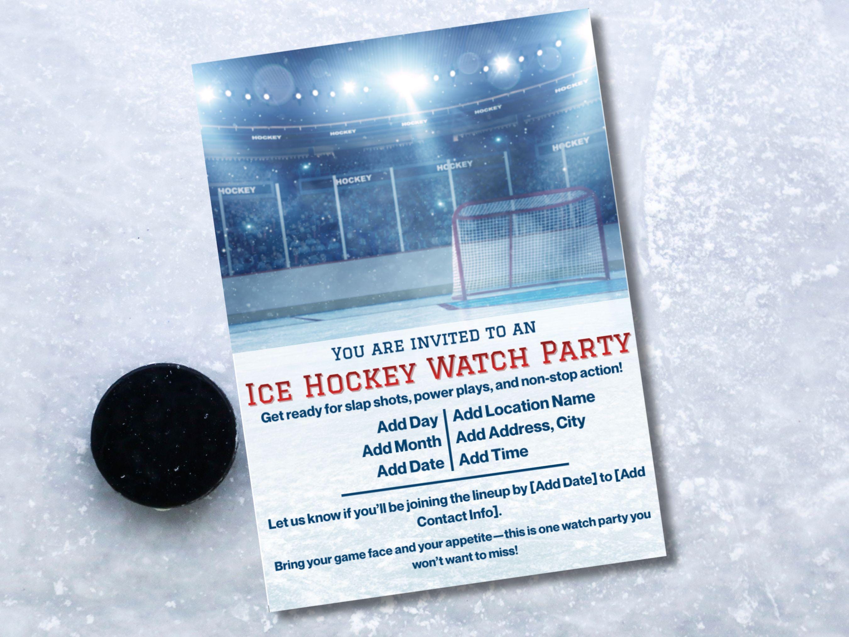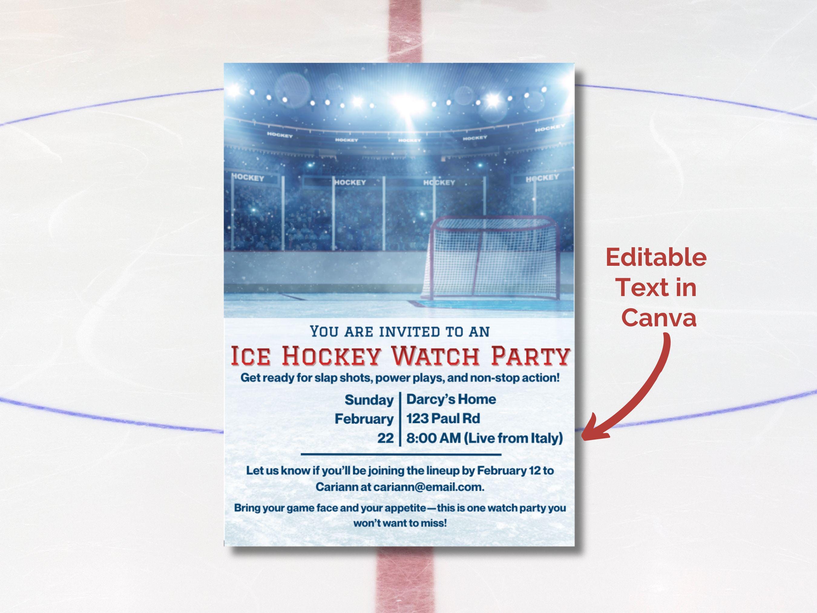 Hockey Watch Party Invitation Template - Editable in Canva Free 🏒🥅 Get ready to host the ultimate game night! Whether it's the Stanley Cup finals, an Olympics showdown, or just cheering on your favorite local team, this vibrant Ice Hockey Watch Party Invitation sets the perfect tone for an action-packed gathering.