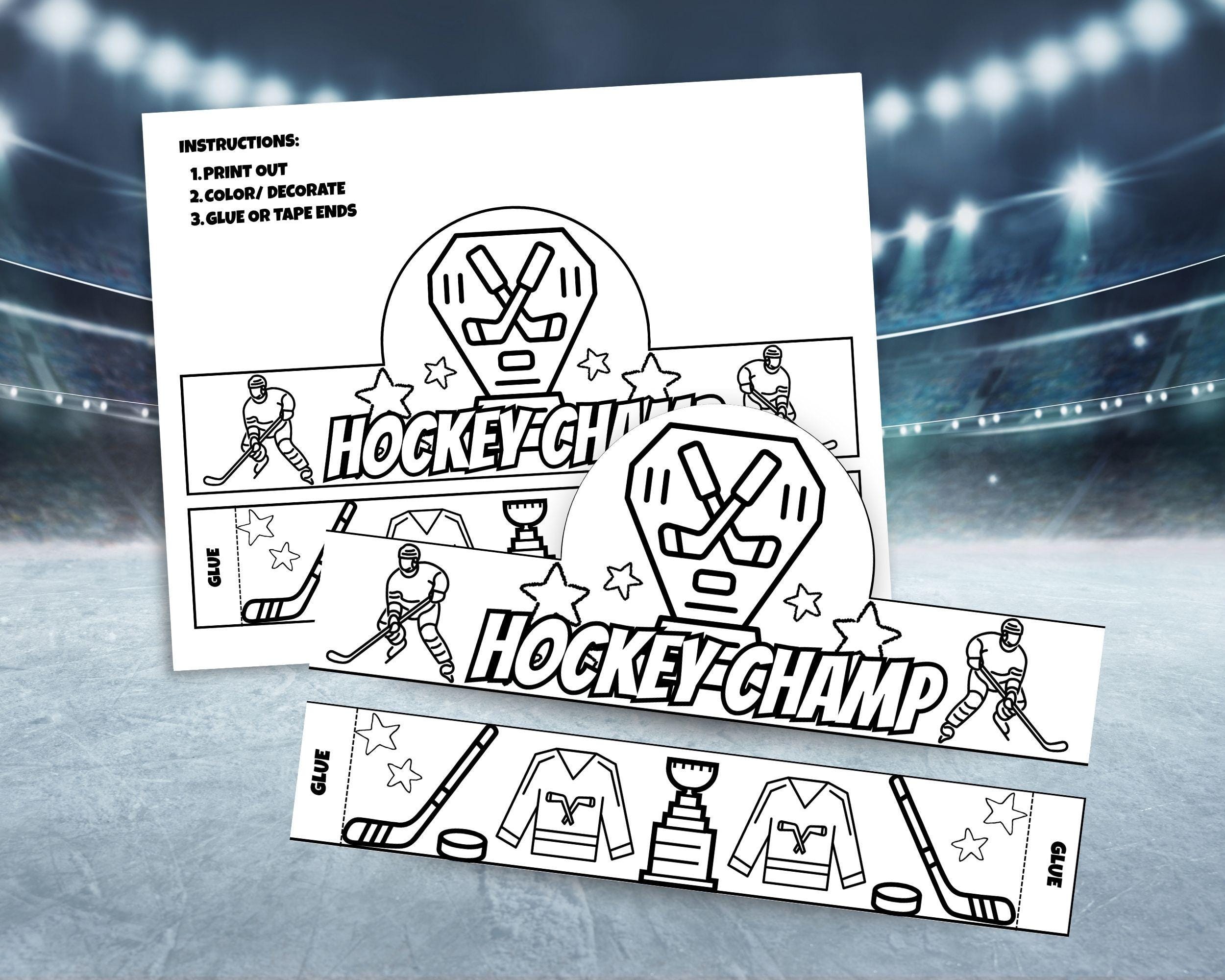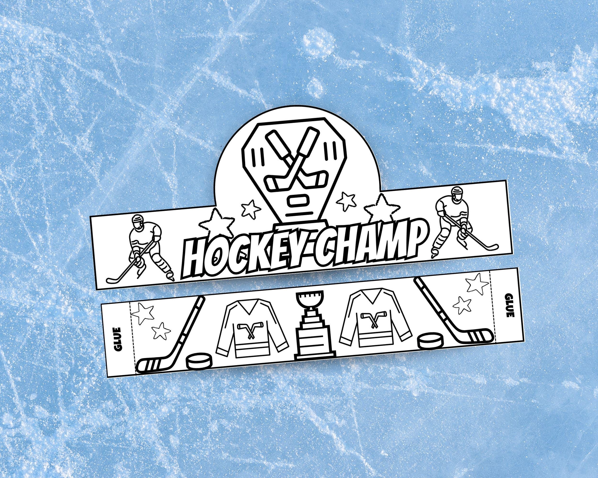 What's Included A high-quality, black and white PDF file of the "Hockey Champ" crown design. One main crown piece featuring bold "HOCKEY-CHAMP" text, action-packed player illustrations, and a champion's crest. An adjustable band with fun hockey icons like jerseys, trophies, sticks, and pucks. Clear and simple instructions for printing, decorating, and assembling.