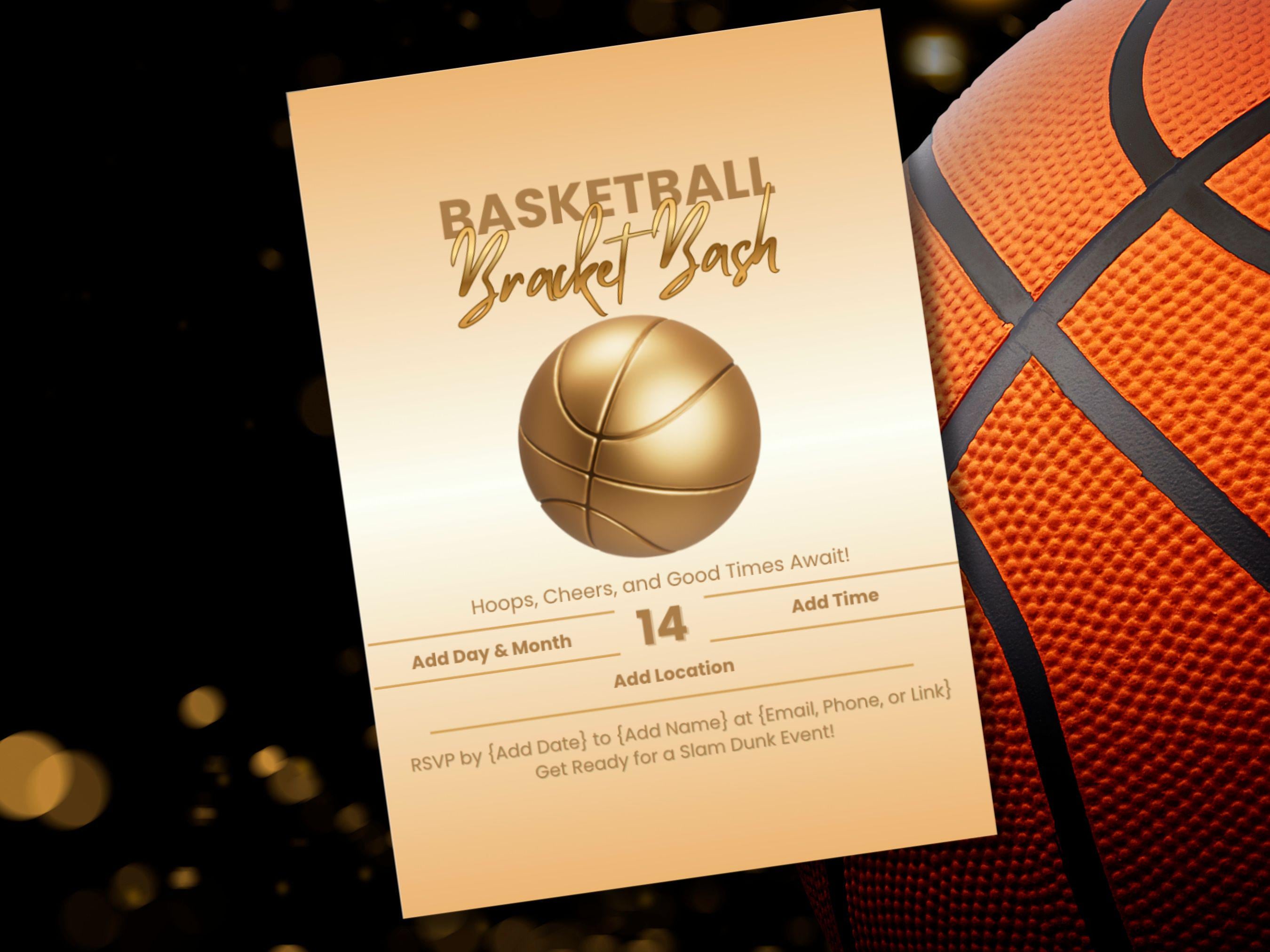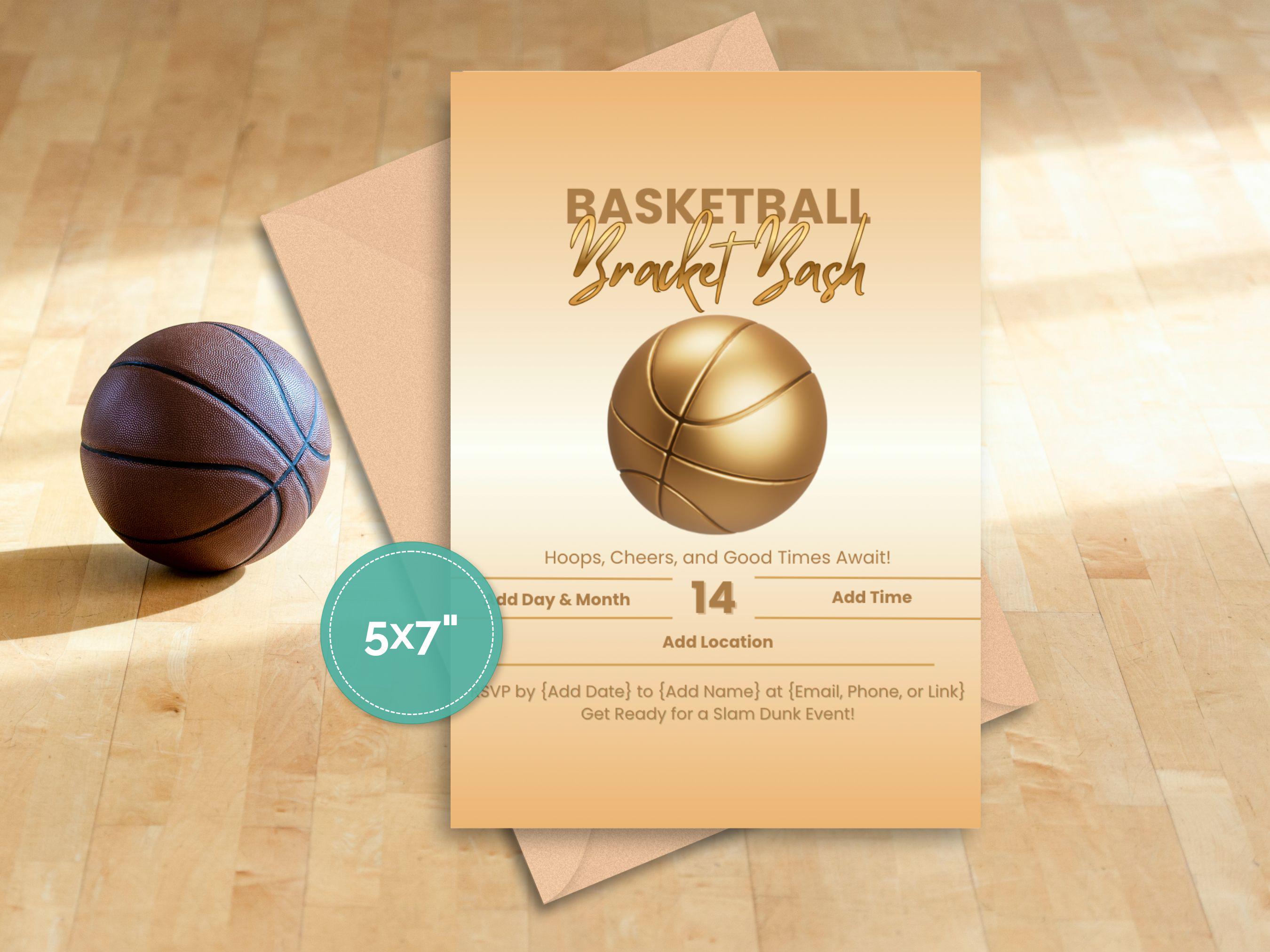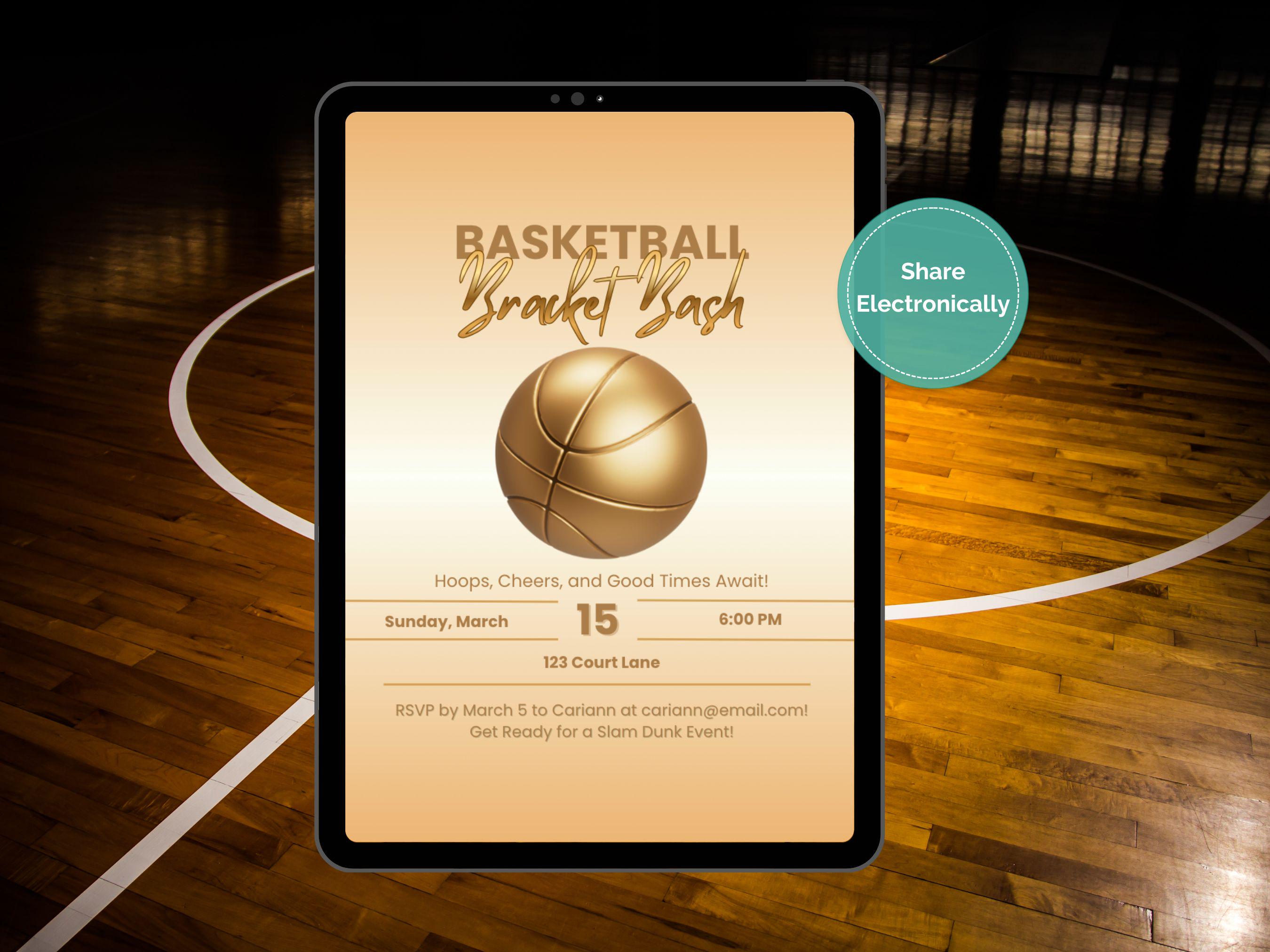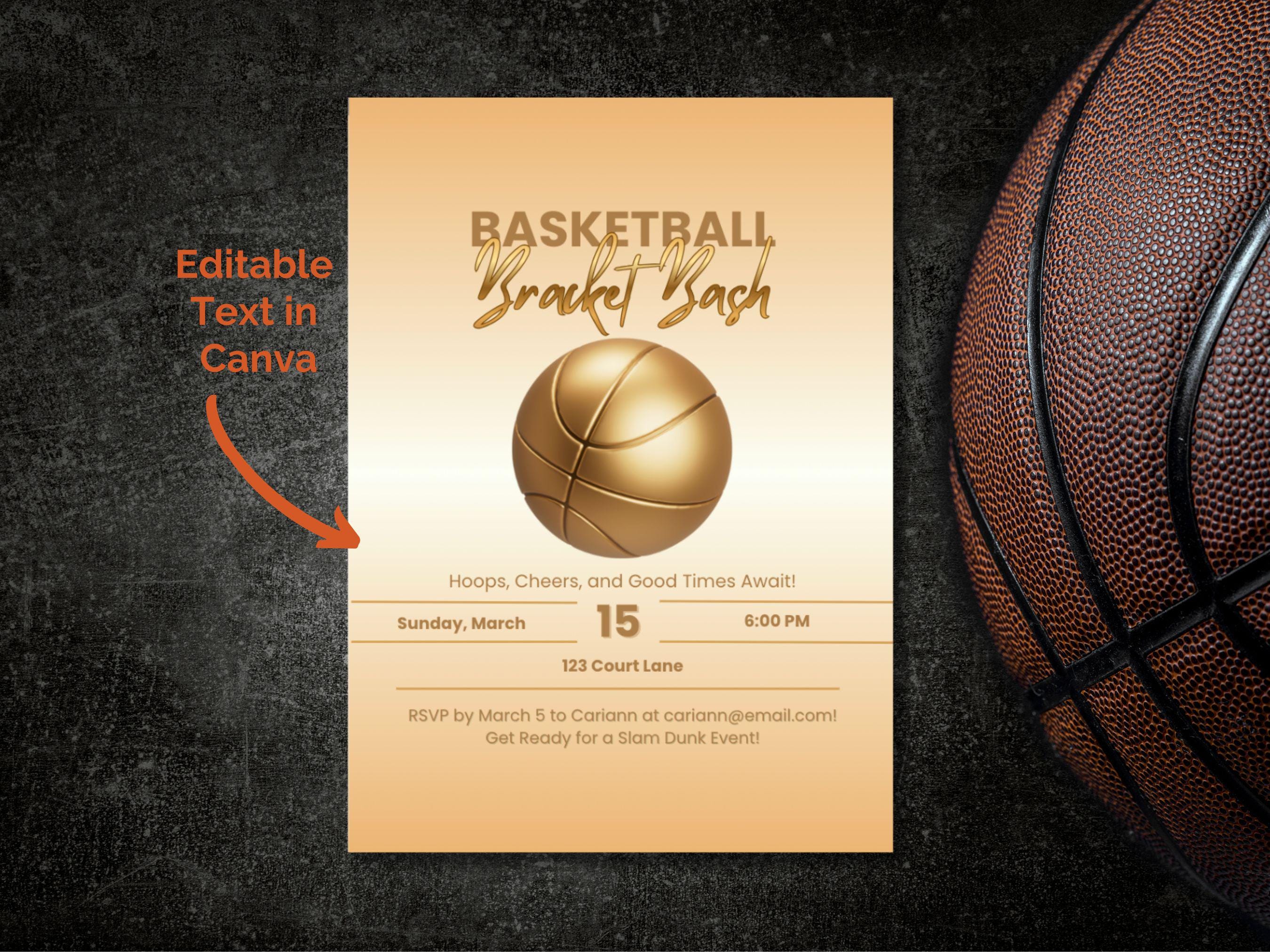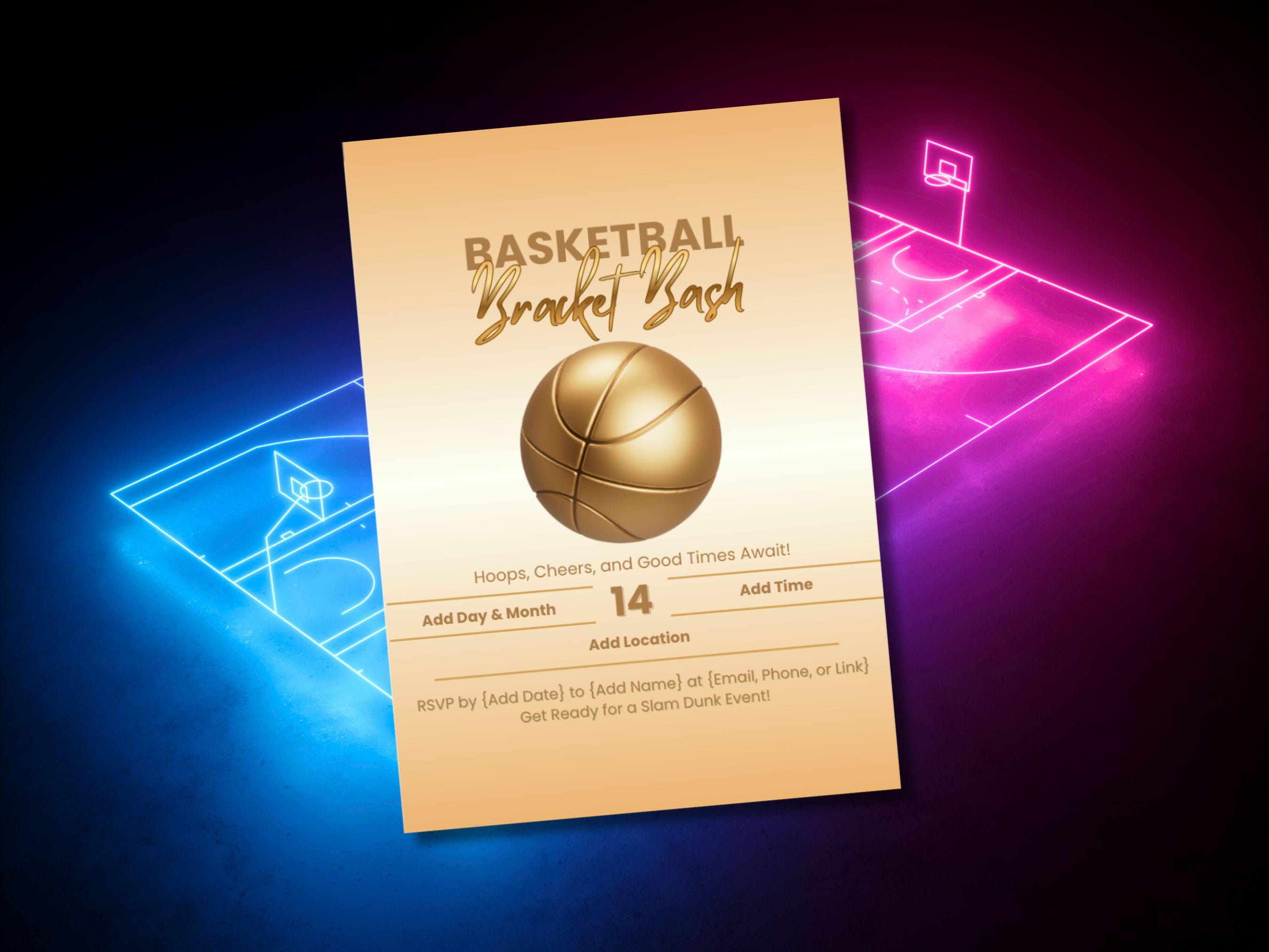 Get ready to host the ultimate basketball viewing party with our "Bracket Bash" invitation template! 🏀 This digital download is the perfect way to gather your friends and family for a slam dunk celebration. With its modern design and golden basketball graphic, this invite sets a winning tone for your event.