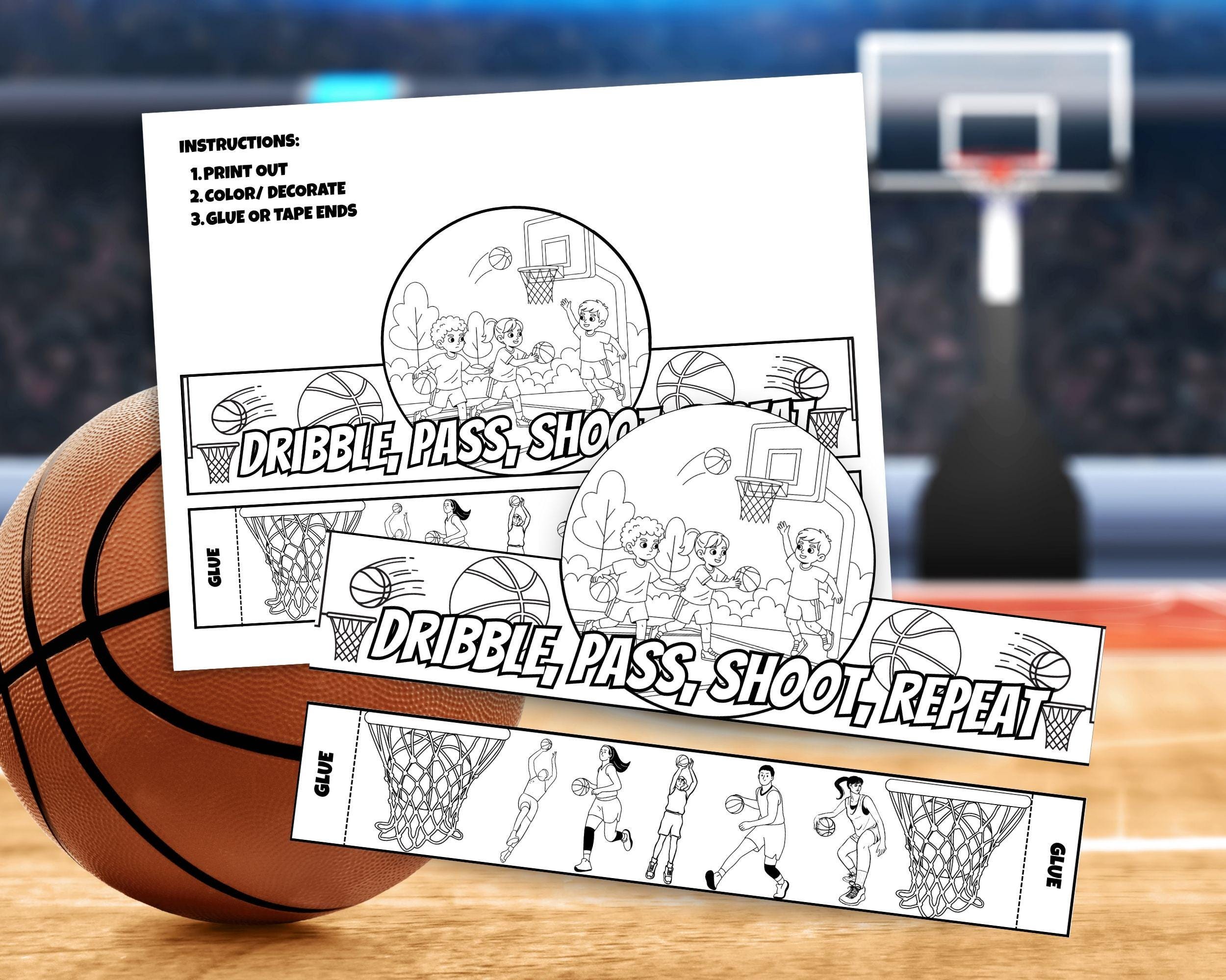 Description 📝 This digital download offers a fun, black-and-white outline that children can color, cut, and assemble into a wearable headband. The main panel captures the energy of the game with a lively scene of three kids playing basketball outdoors—dribbling, holding the ball, and reaching for a shot. Below the main scene, the bold text "DRIBBLE, PASS, SHOOT, REPEAT" reminds players of the fundamentals of the game. The side bands add even more flair, featuring individual illustrations of players in motion and basketball nets, making the crown dynamic from every angle.