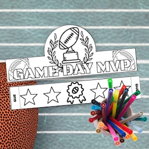 How It Works ✂️ Download & Print: Access your file immediately after purchase and print on standard 8.5" x 11" paper or cardstock. Color & Create: Encourage kids to use markers, crayons, or colored pencils to customize their crowns with their team colors. Cut & Connect: Cut out the strips and use the clearly marked "Glue" tabs to connect the ends for a comfortable fit.