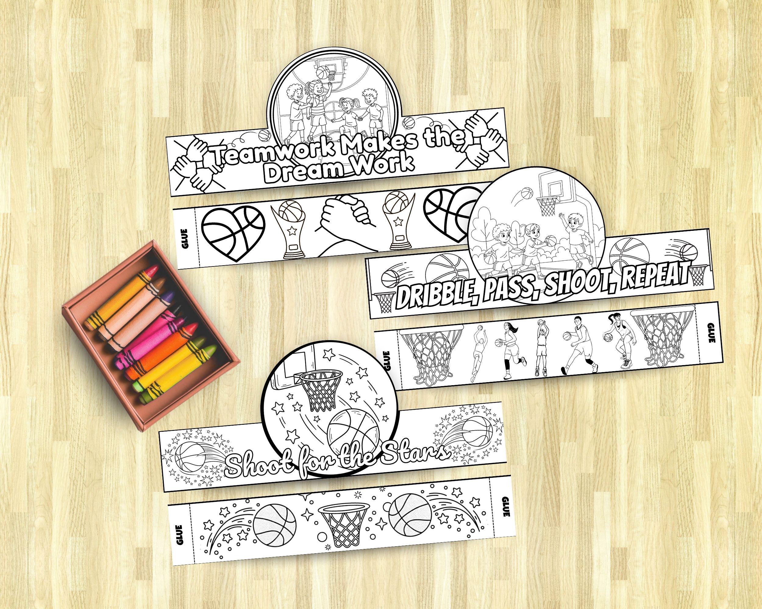 What's Included in the Bundle? 📦 You'll receive three unique, high-quality PDF files, each featuring a different basketball-themed crown design that kids can color, cut, and assemble. 1. "Teamwork Makes the Dream Work" Crown: Celebrate collaboration with this engaging design! It features a lively scene of kids playing together, reinforced with symbols of partnership like clasped hands and the central motivational message. A perfect tool for teaching cooperation. 🤝 2. "Dribble, Pass, Shoot, Repeat" Crown: Get into the fundamentals of the game! This action-packed crown features players in motion and the core skills mantra. It's ideal for basketball camps, clinics, or getting hyped for the big game. 🔁 3. "Shoot for the Stars" Crown: Inspire big dreams with this celestial design! A basketball soars through a sky of stars and planets, encouraging kids to aim high. It’s a magical way to mix sports with ambition. 🚀
