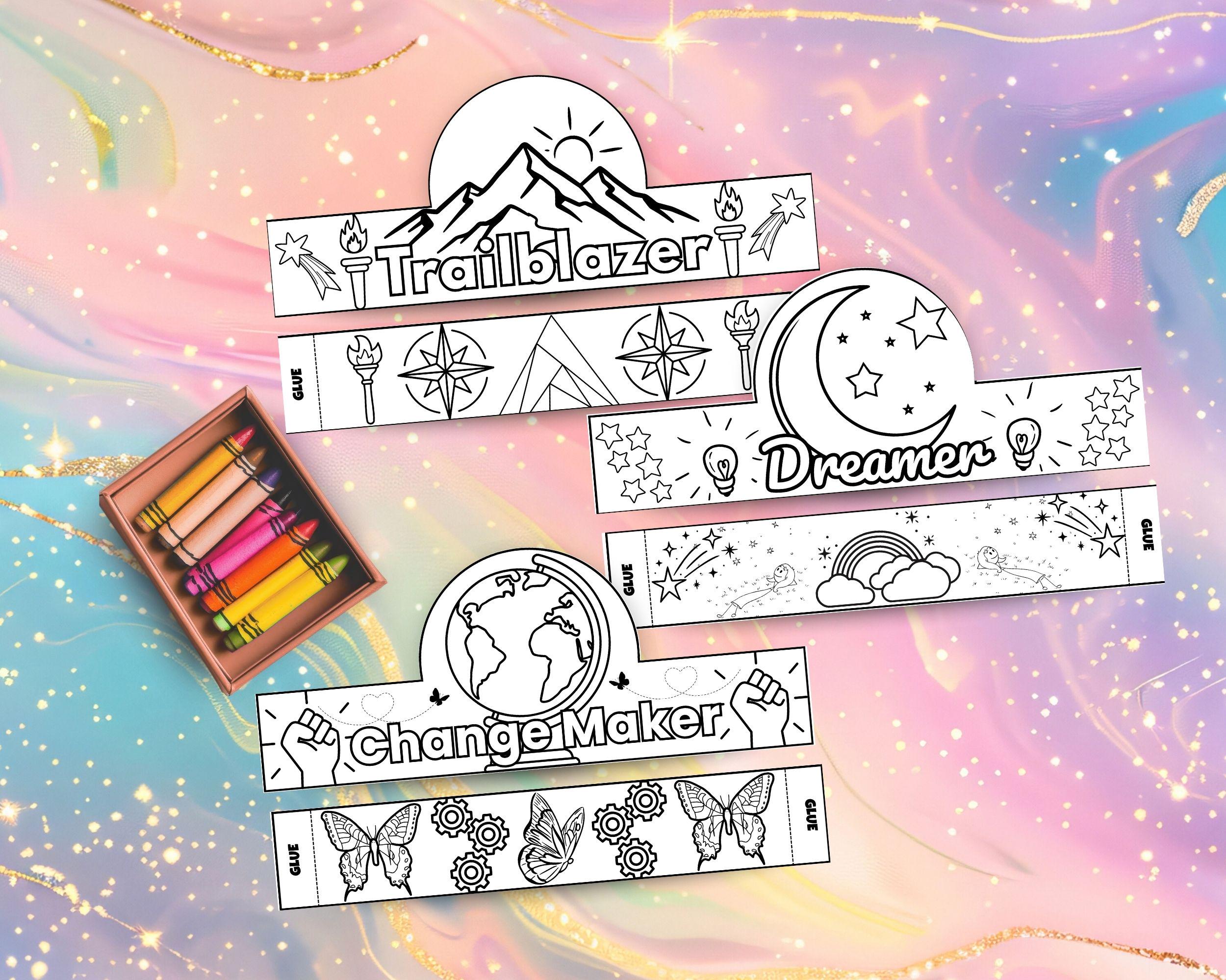 What’s Included 📄: 3 Printable PDF files (8.5" x 11") 🖨️ Trailblazer Crown: Adventure-themed with mountains, stars, and torches 🏔️🔥 Dreamer Crown: Celestial-themed with moons, stars, and rainbows 🌙🌈 Change Maker Crown: Empowerment-themed with a globe, fists, and butterflies 🌍💪 Easy-to-follow instructions for coloring and assembly ✂️