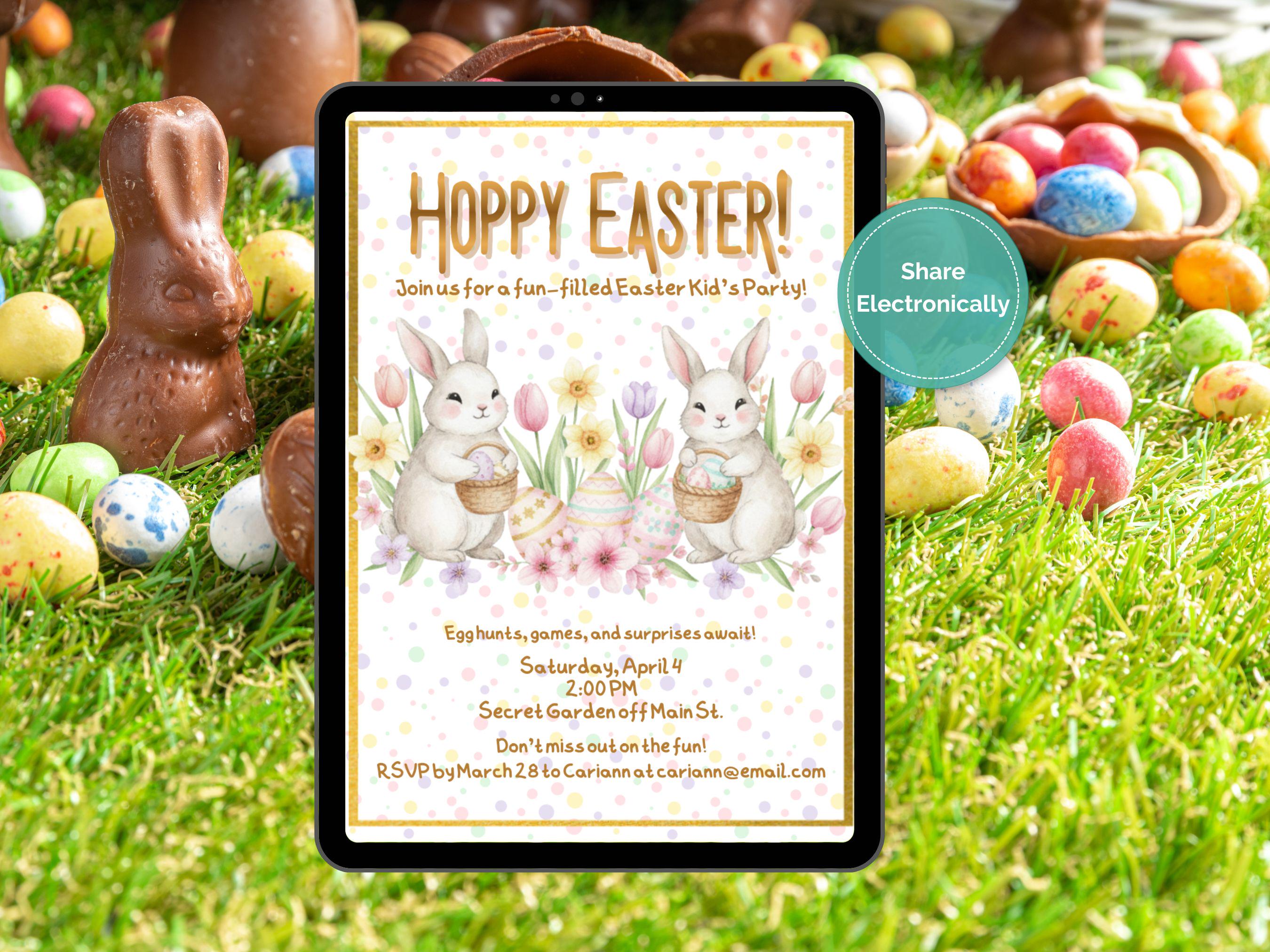 🎨 Features: Whimsical watercolor bunnies, flowers, and Easter eggs Pastel polka dot background for a playful touch Easy-to-edit text for your event details (date, time, location, RSVP)