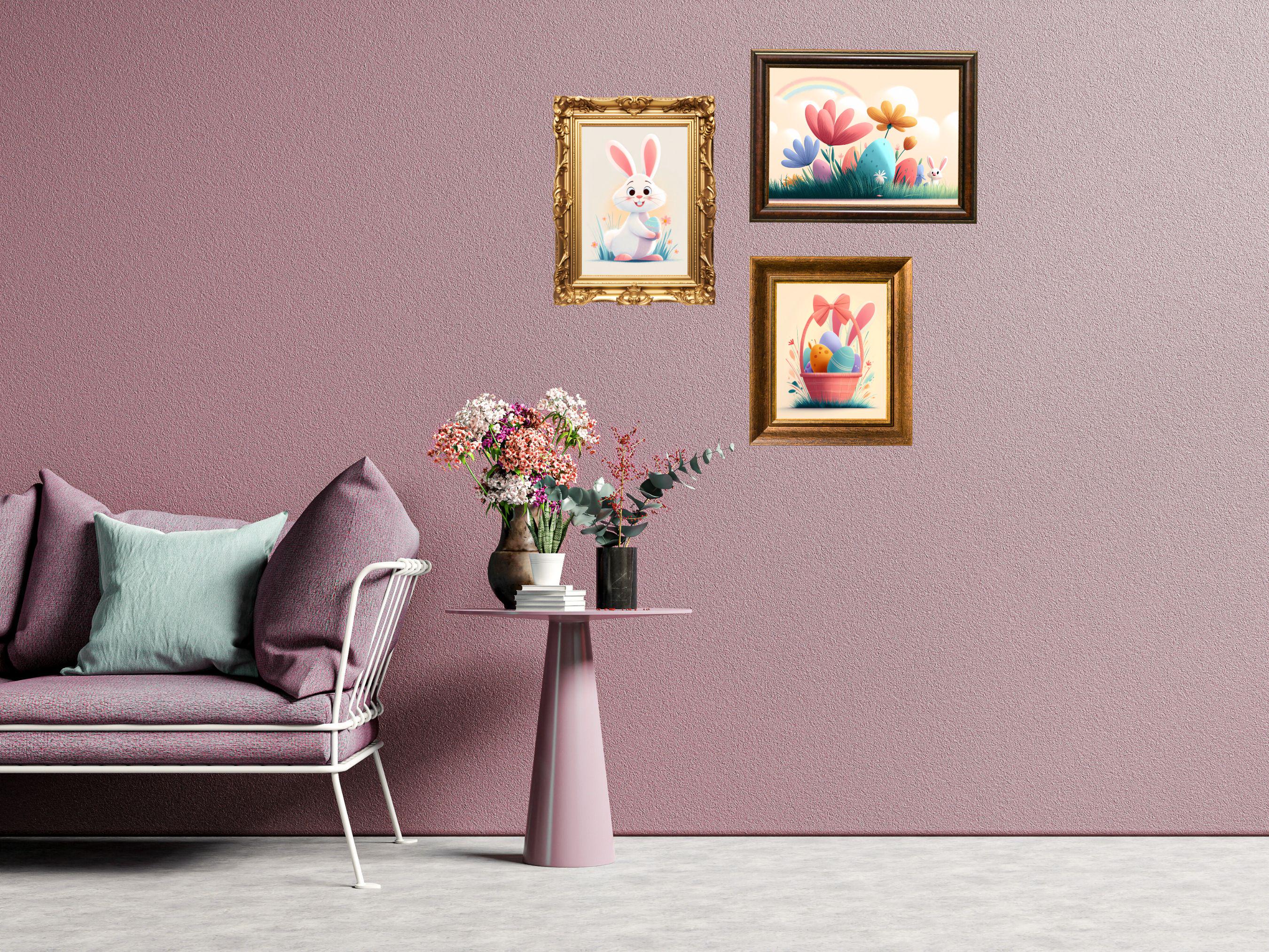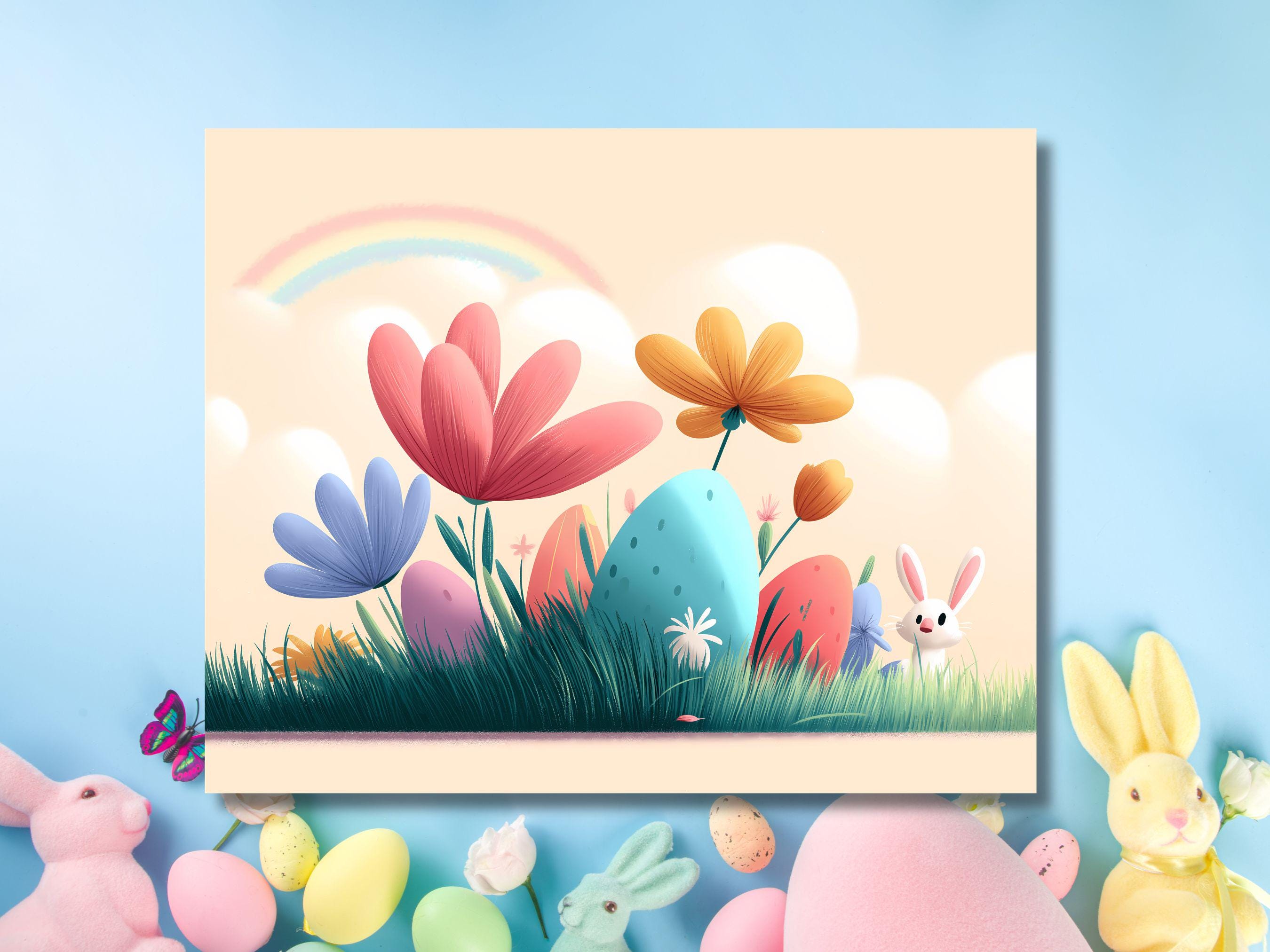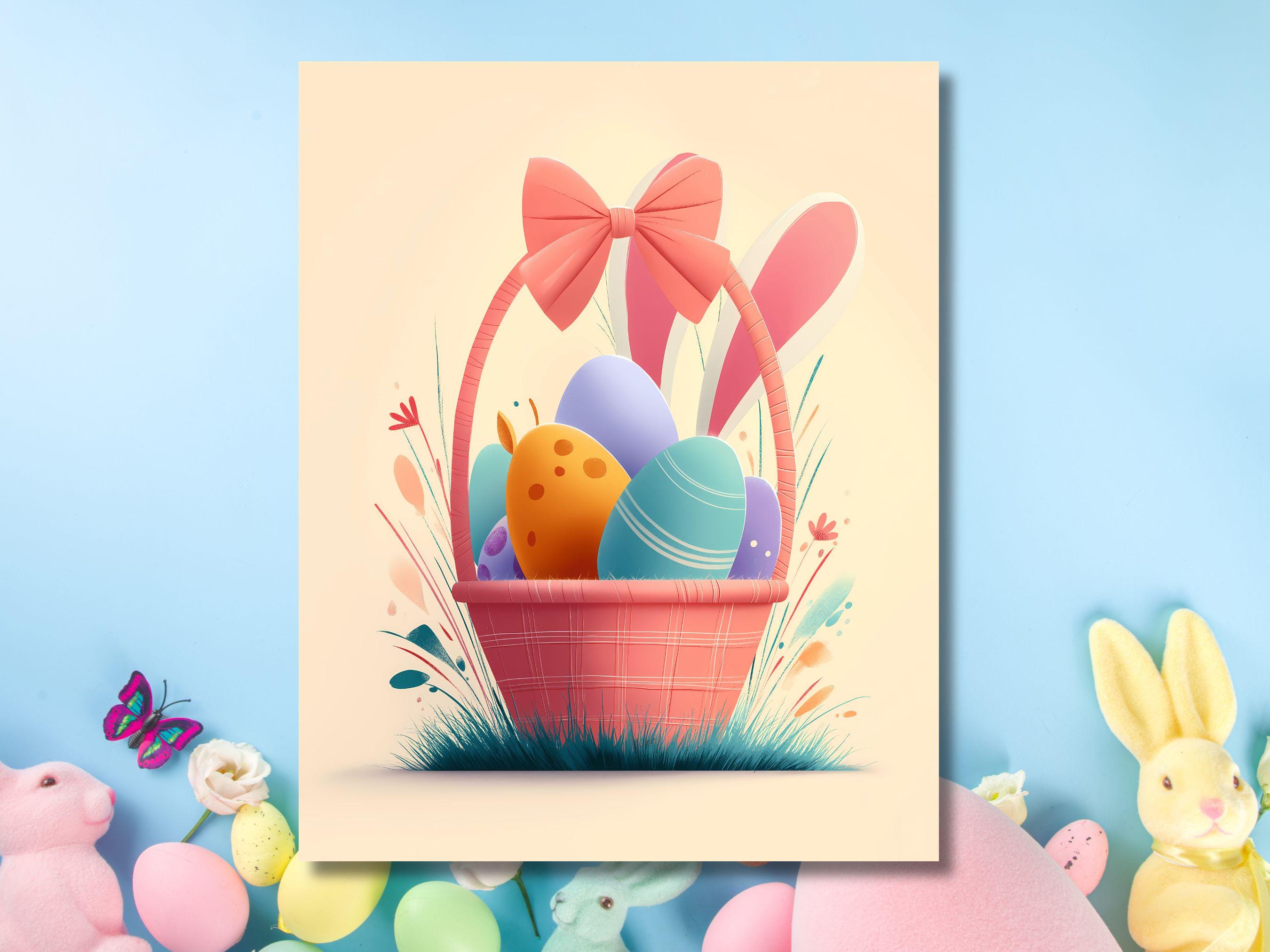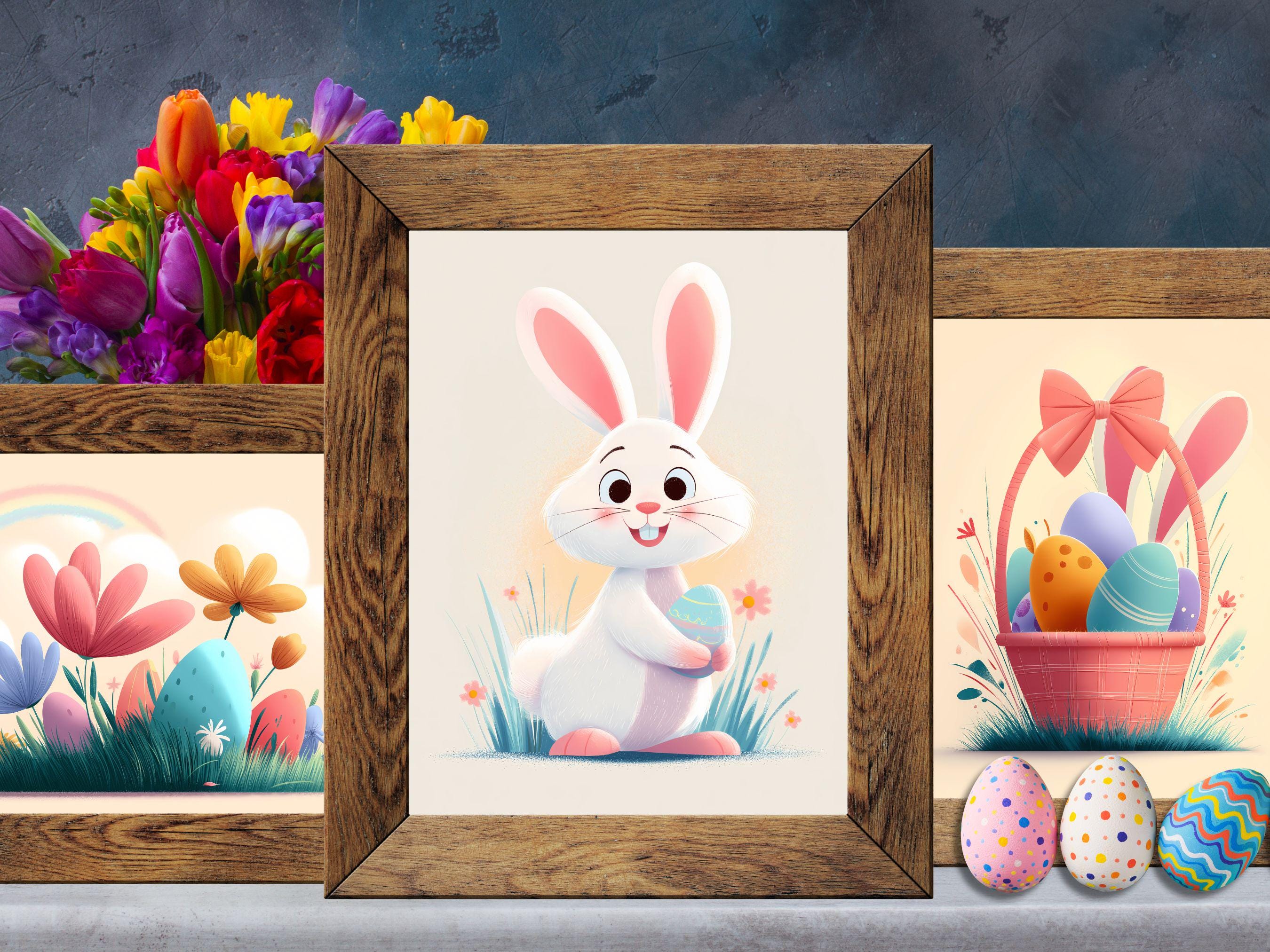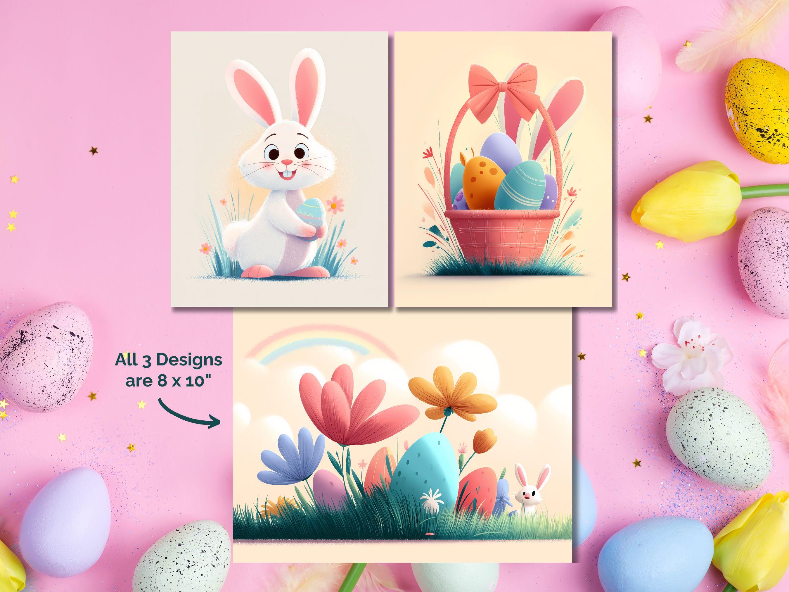What’s Included: 🖼️ 3 Digital Prints: 🐇 Playful Bunny: A cheerful white bunny holding a colorful Easter egg, surrounded by grass and flowers. 🧺 Easter Basket: A pastel pink basket filled with vibrant eggs, topped with a big bow and bunny ears. 🌈 Springtime Scene: A whimsical landscape with oversized flowers, hidden eggs, and a magical rainbow.