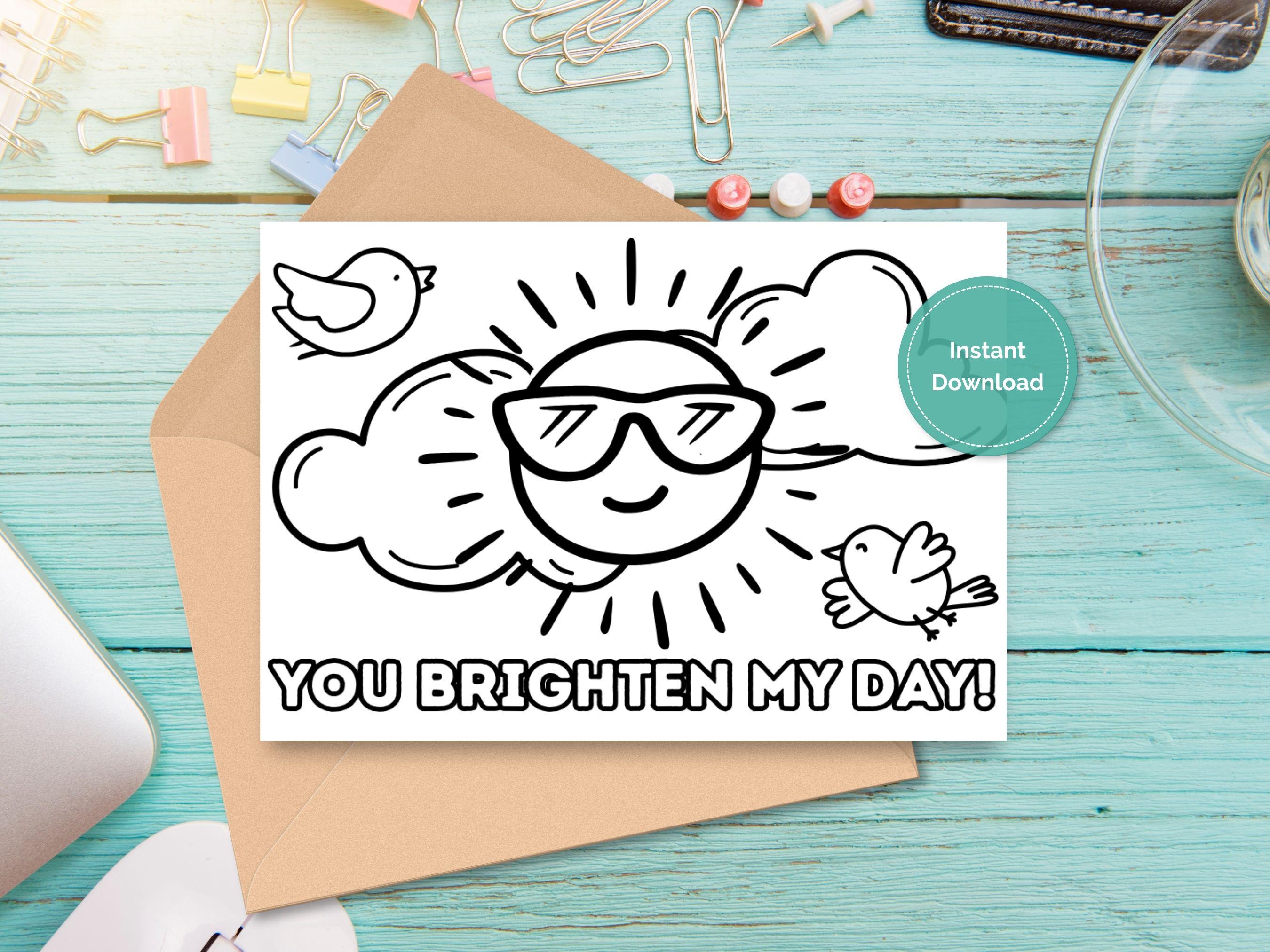 "You Brighten My Day!" ☀️ – Featuring a cheerful sun with sunglasses and playful clouds, perfect for coloring fun.