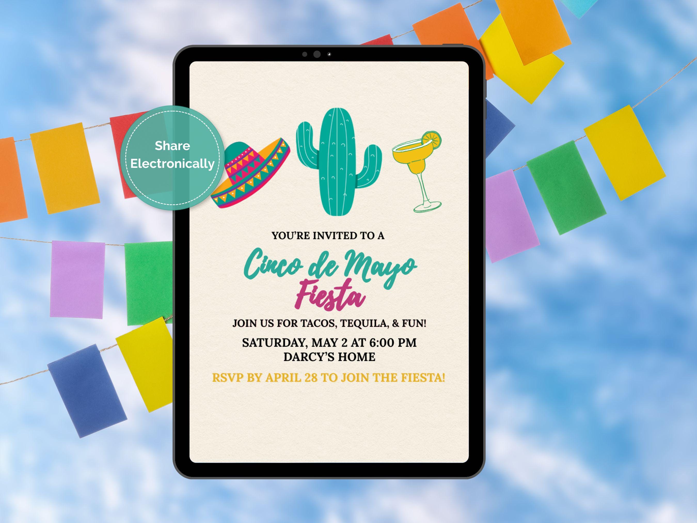 Invite your friends to a memorable celebration with this fun and festive Cinco de Mayo invitation! This minimalist design brings the party to life with bright, colorful graphics, including a playful sombrero, a cheerful cactus, and a refreshing margarita. It is the perfect way to let your guests know they are in for a great time filled with tacos and tequila.