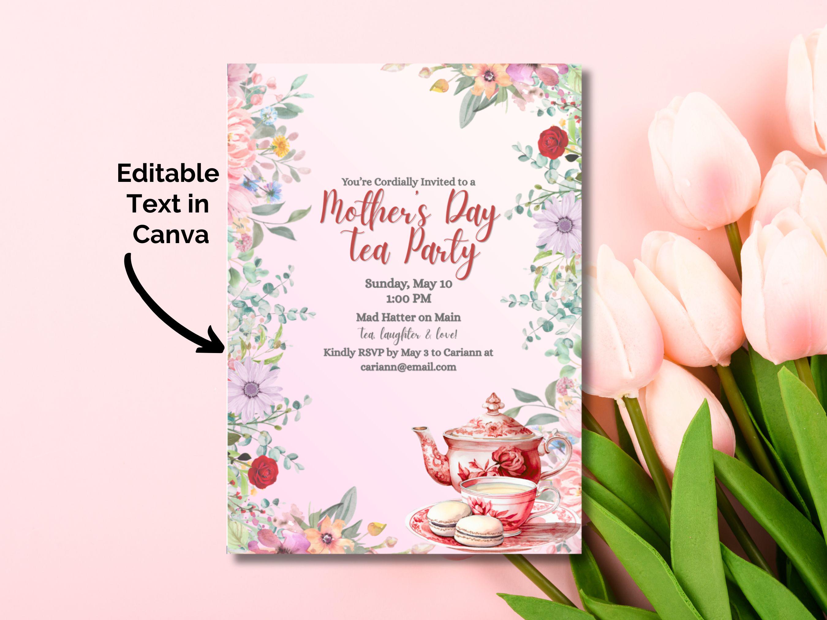 Mother's Day Tea Party Invitation - Editable Floral Template with Teapot Design (Editable in Canva)