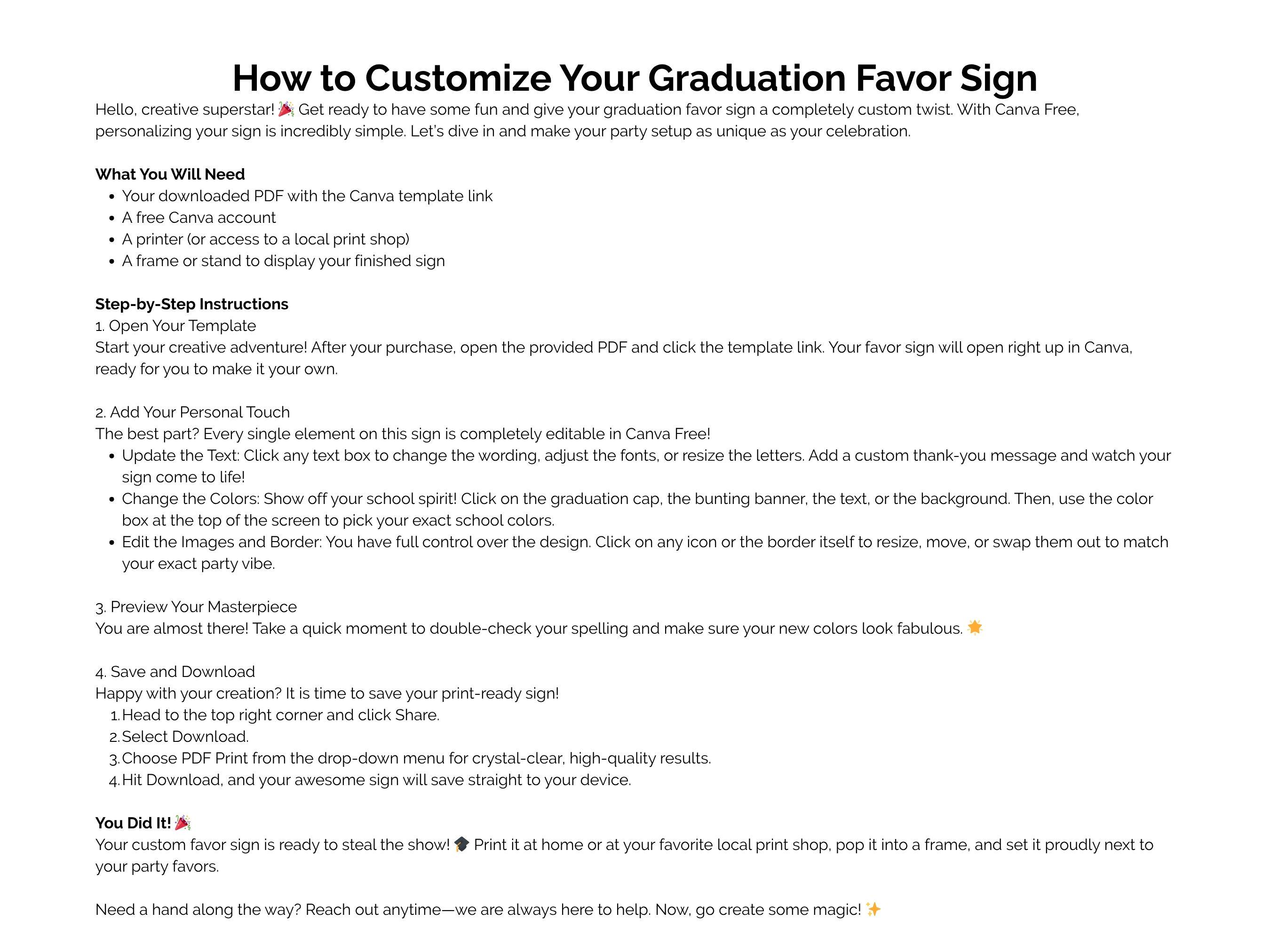 1 PDF document containing the direct link to your editable Graduation Favor Sign template